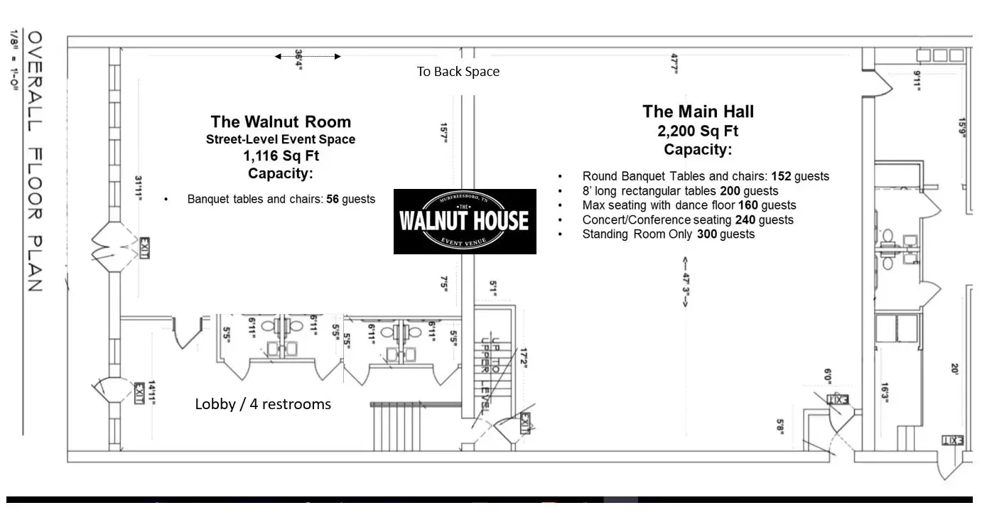 Whether it's a wedding, reception, conference, concert, fundraiser, or any other event, the Walnut House can accommodate up to 160 guests with banquet tables and a dance floor. For larger gatherings, we can host up to 240 guests with theater-style seating for meetings or conferences, or up to 300 guests for concerts and events with no seating. We have professional sound, lights, and video walls in our Main Hall, making it effortless for you to decorate and create a custom environment tailored to your event theme. We offer several room sizes to suit your specific needs, ensuring that your event is both intimate and memorable. We work closely with you to ensure every detail aligns with your vision.
