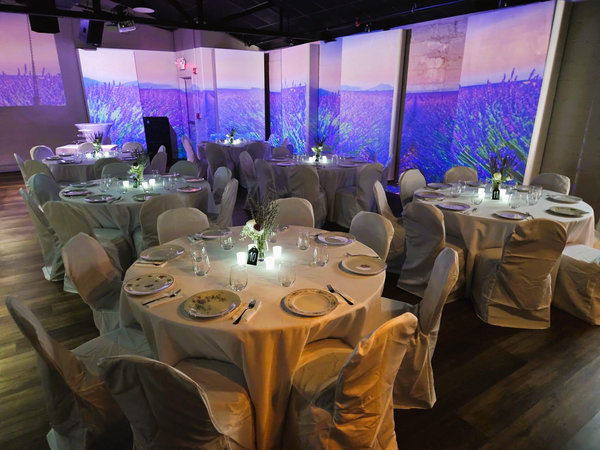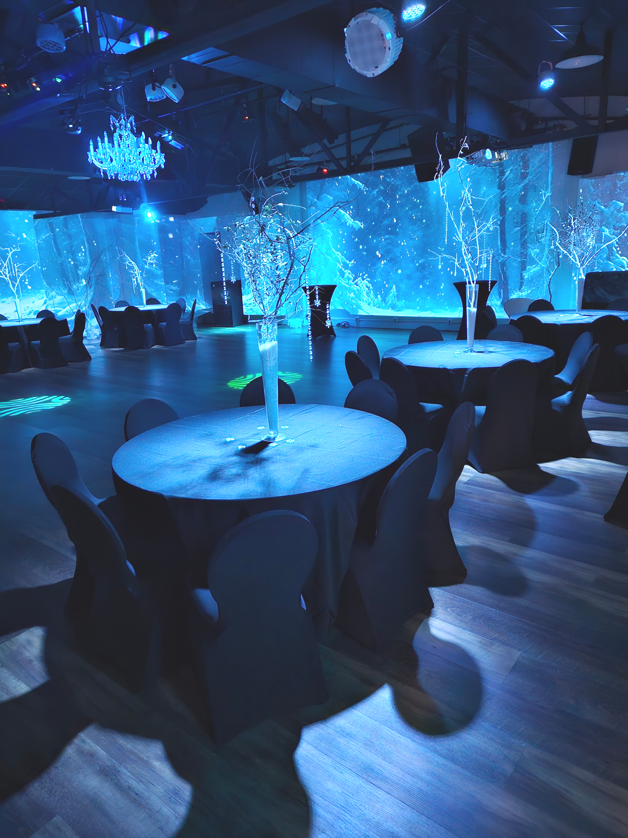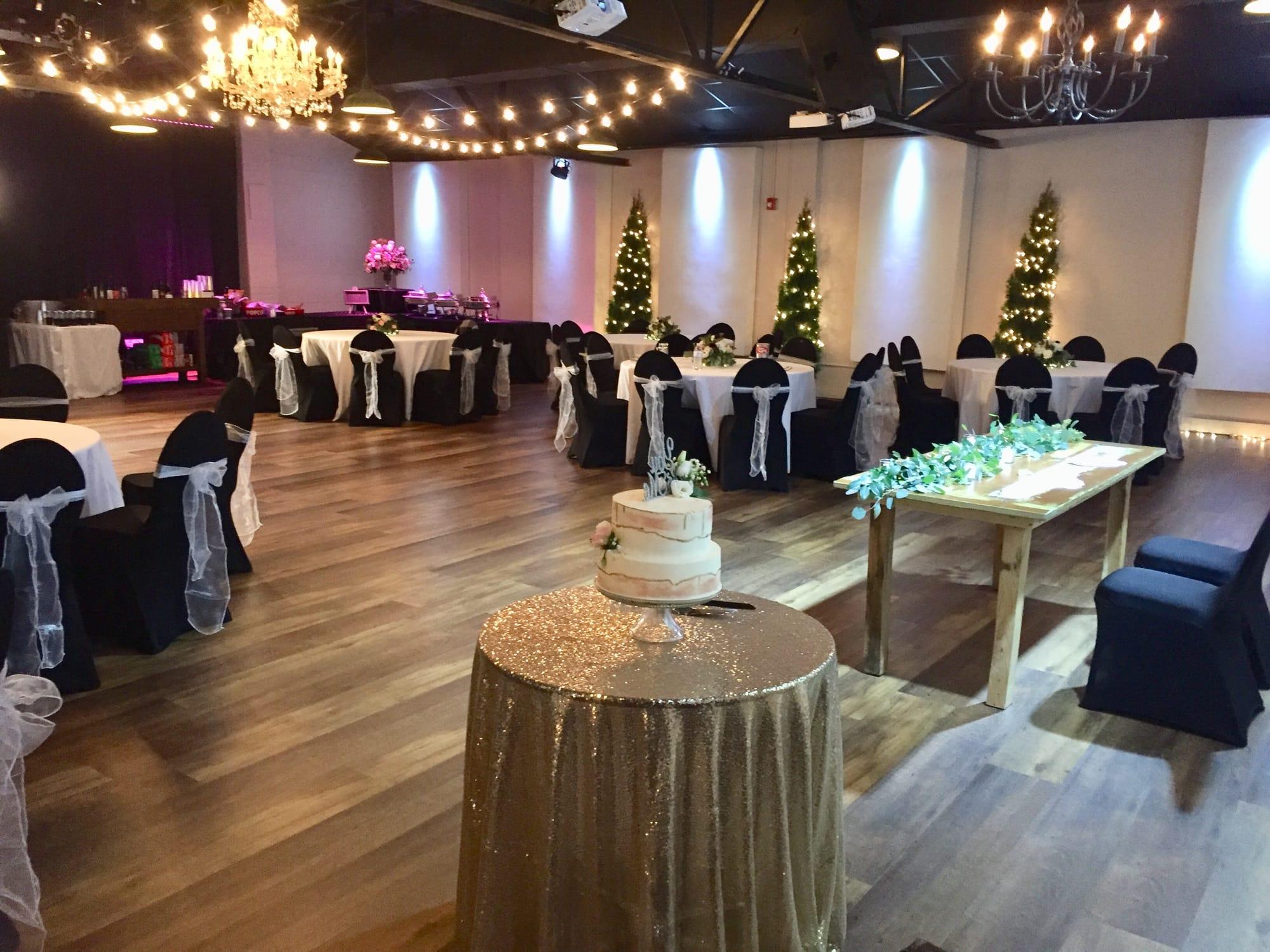 Complete Wedding Package: • The Main Hall • The Walnut Room • Bridal Suites – Brides Private dressing room, beautiful bar (make-up station), lounge, loft, powder room, live view of Main Hall •Grooms Lounge – private restroom, and live view of Main Hall • Banquet Tables & Chairs • Select your own Caterer / Bartender / DJ • Immersive Wall Projection • Concert Sound System • Customized lighting • Chandelier •Photo Booth • Live Stream & recorded your ceremony • Parking • Cleaning