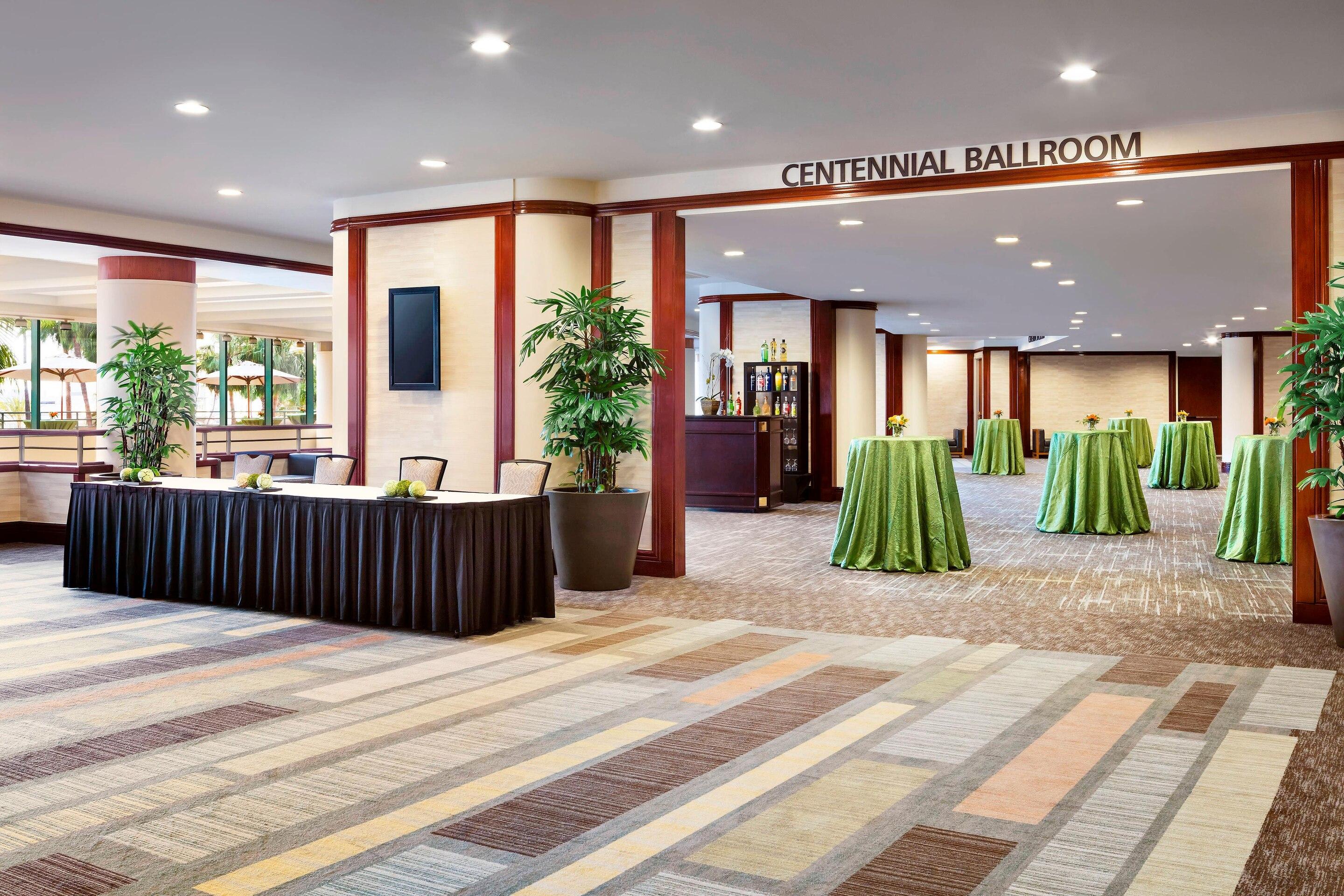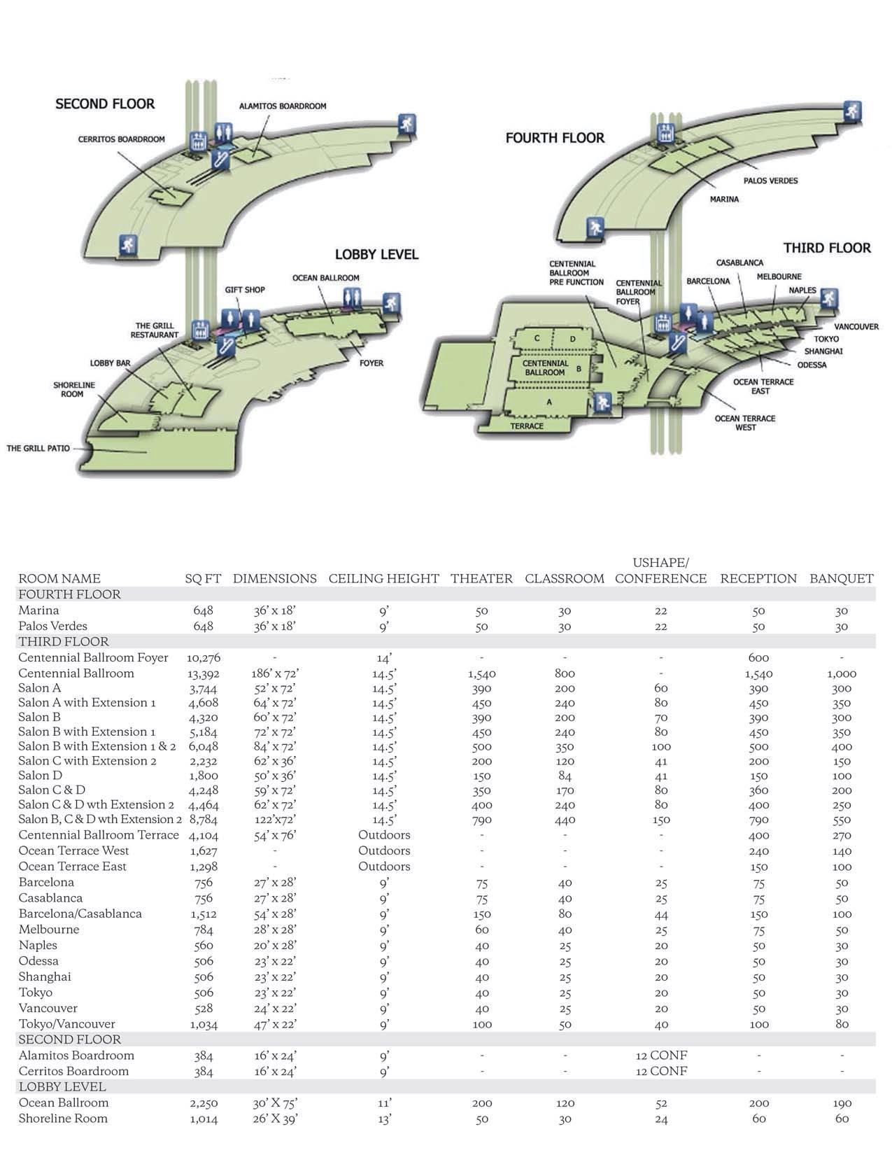 Elegant Centennial Ballroom can accommodate up to 800 guests and offers a large, private foyer pre-function area for cocktails, mingling and photos. Largest hotel ballroom in downtown Long Beach - 13,392 square foot Centennial Ballroom offers seating for up to 1,540 people and is the only ballroom in the city with access to an outdoor terrace.