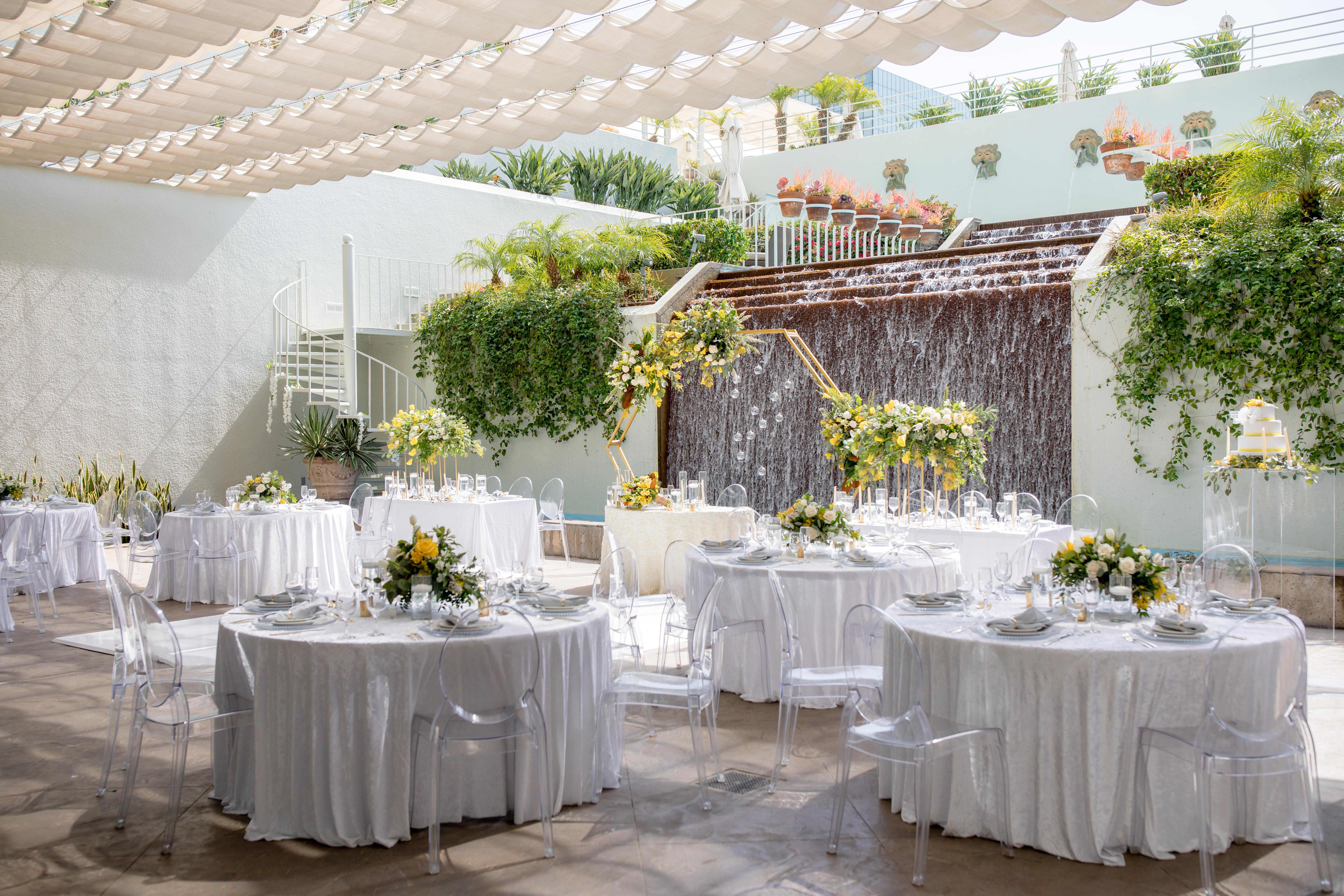 Exchange vows before a cascading waterfall on our 1,800 square-foot waterfall terrace, which accommodates up to150 guests against a stunning backdrop of flowering vines.