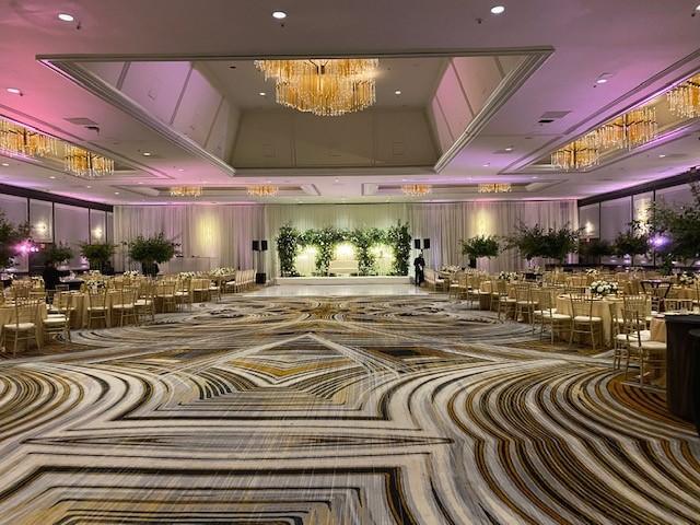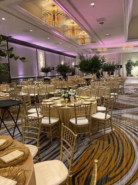 The Italian pre-function room is a marbled foyer with hand-painted gold ceilings. The 10,000-square-foot ballroom has 16’ ceilings with chandeliers and a stage. Large events are held in the Grand Ballroom, which is easily transformed by your choice of décor and can accommodate up to 800 guests. Receptions often start with cocktails in the Colonial and Italian Rooms, then flow into the adjacent Grand Ballroom for the main affair.