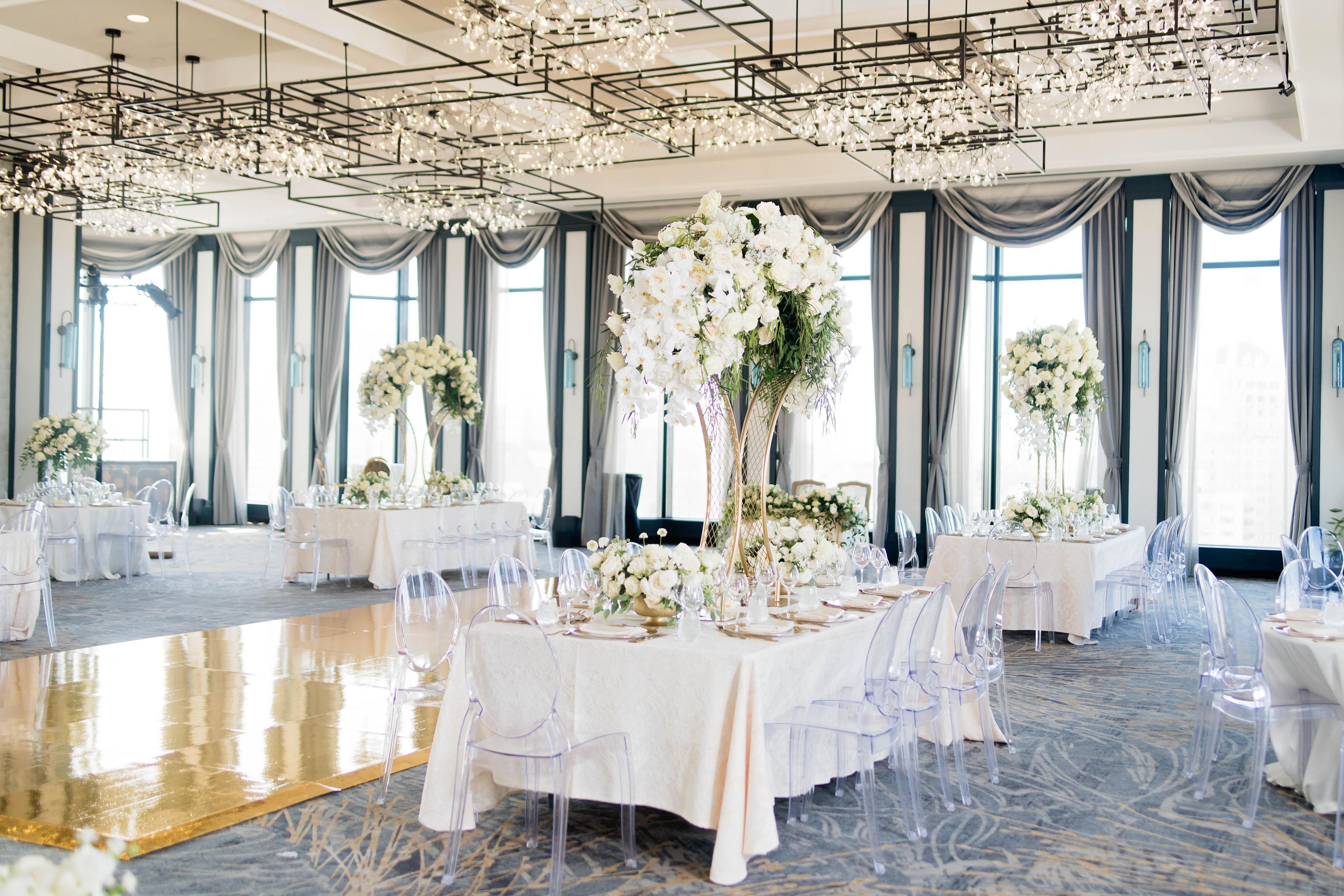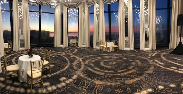 Deemed "the most spectacular special event venue in Northern California," accessed by five glass elevators, and located on the 32nd floor of the Tower Building. All-new interiors reflect a modern design aesthetic with cream-toned walls, gold accents, and dark hardwood floors, while maintaining the integrity of original architectural elements such as detailed molding and coffered ceilings.