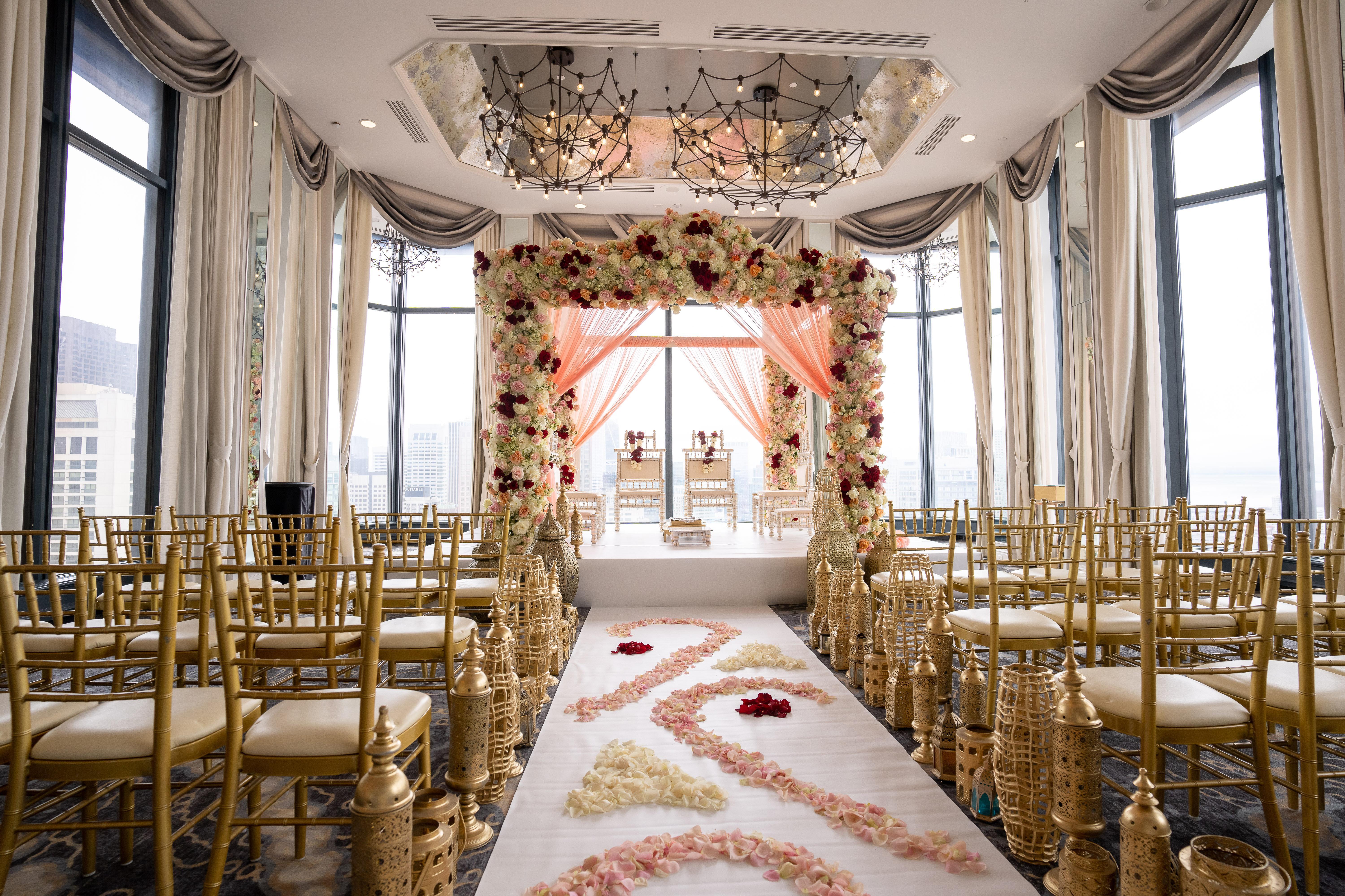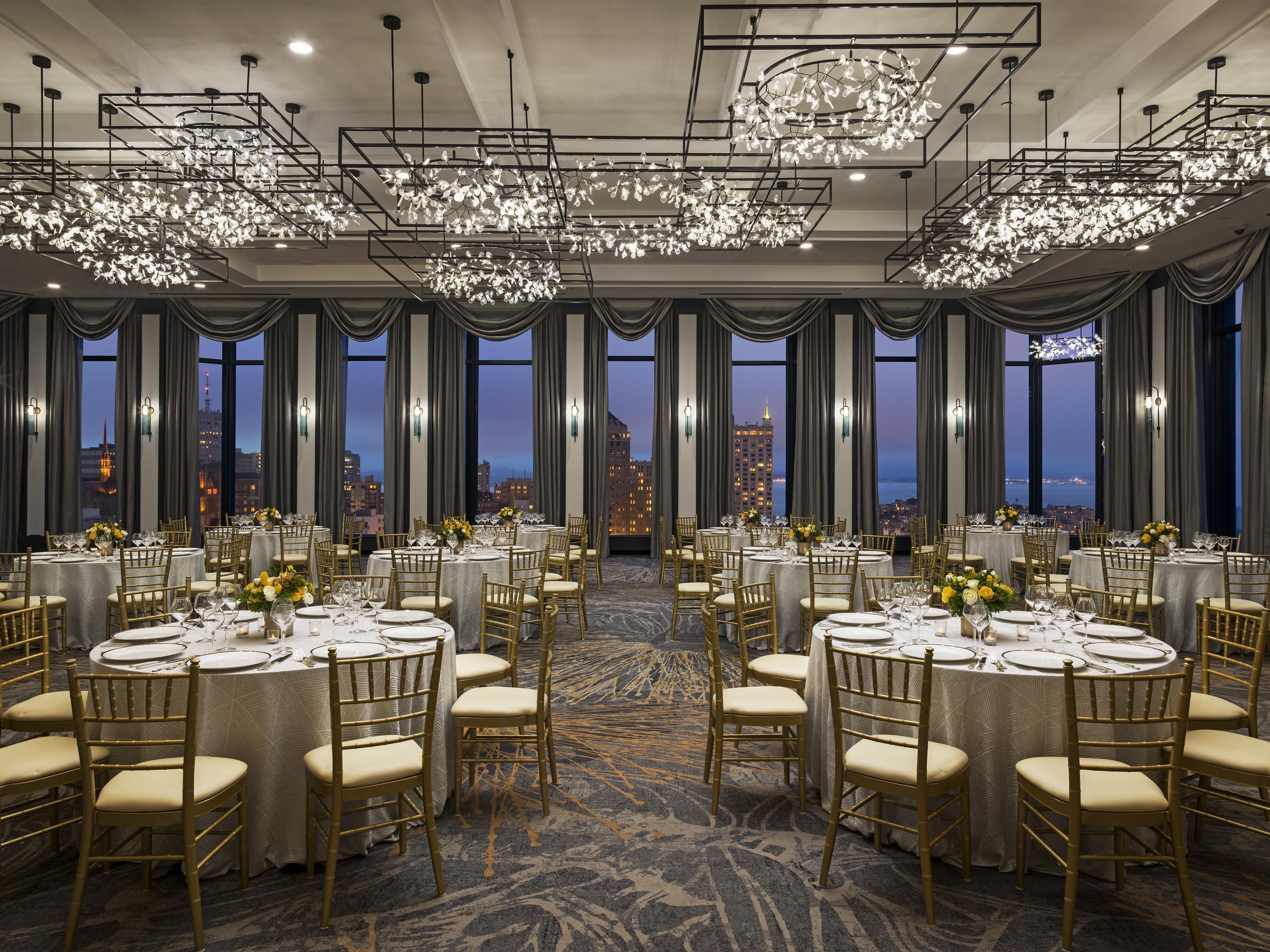 With floor-to-ceiling windows, making it the ultimate wedding destination for exchanging vows. Just like the Golden Gate room It offers sophisticated settings along with breathtaking floor-to-ceiling views that extend from the Bay Bridge to the Golden Gate—the nighttime display of city lights is dazzling! All-new interiors reflect a modern design aesthetic with cream-toned walls, gold accents, and dark hardwood floors, while maintaining the integrity of original architectural elements such as