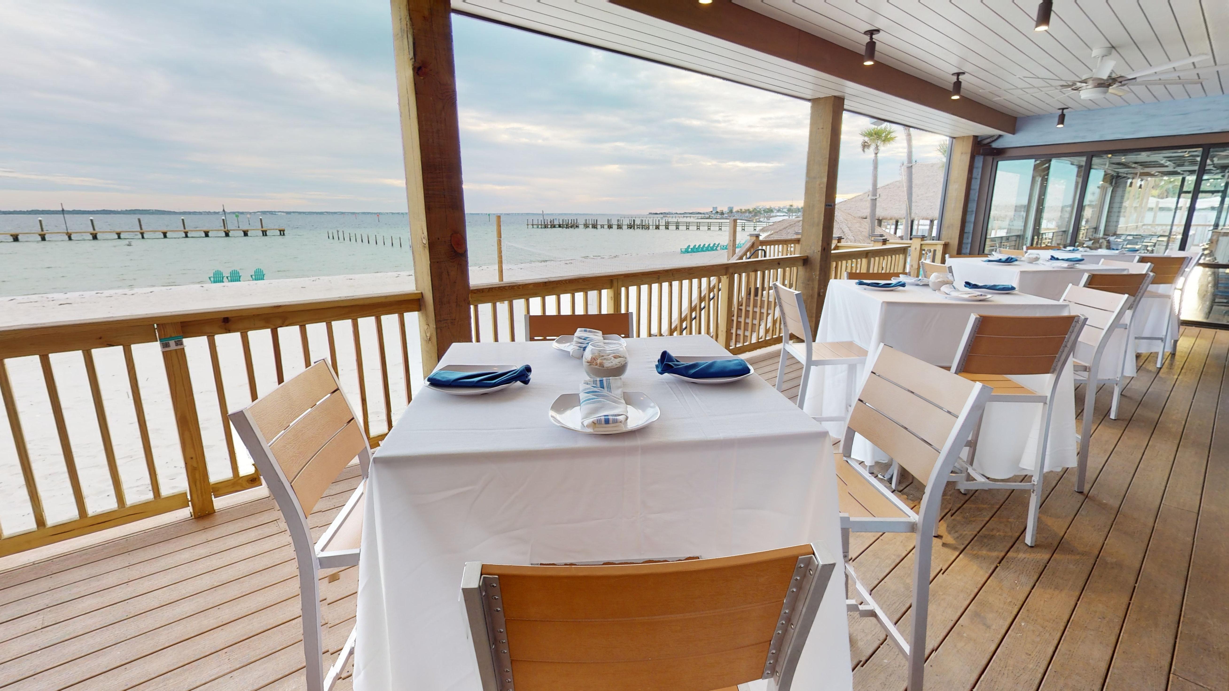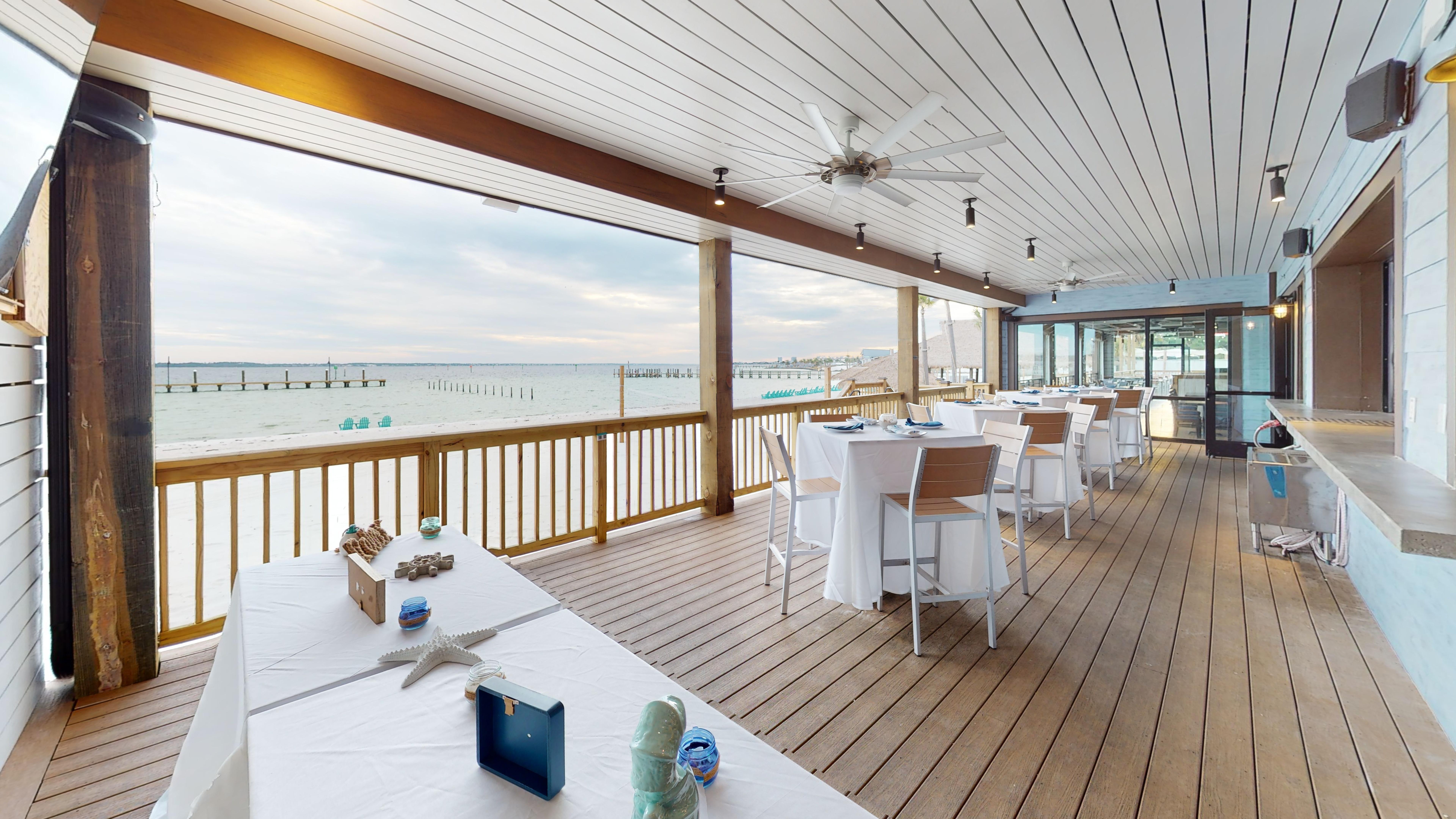 Our Pelican Room & Deck is a fully private upstairs area that is Handicap accessible! This room offers a beachfront view of the Santa Rosa Bay, includes our house tables, chairs, and linens, two bars, private banquet kitchen, and A/V capabilities!