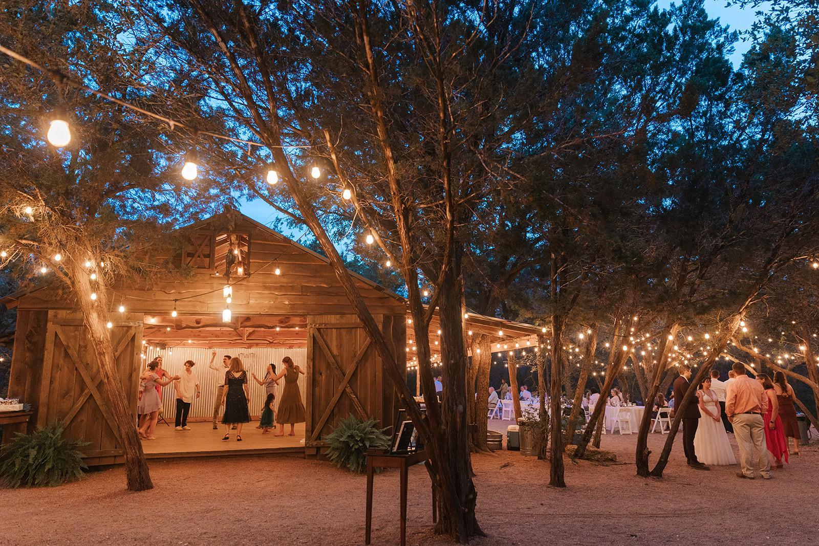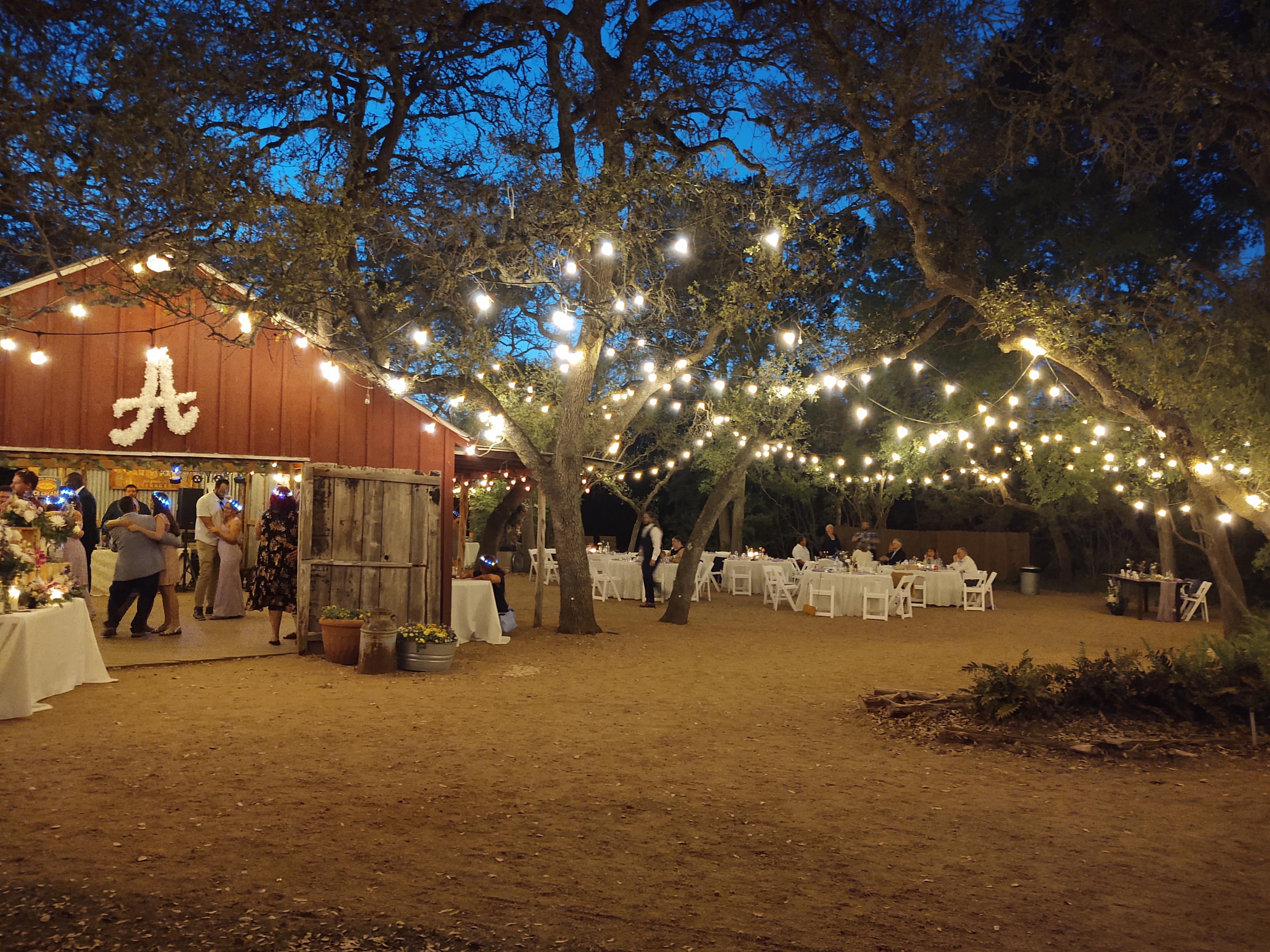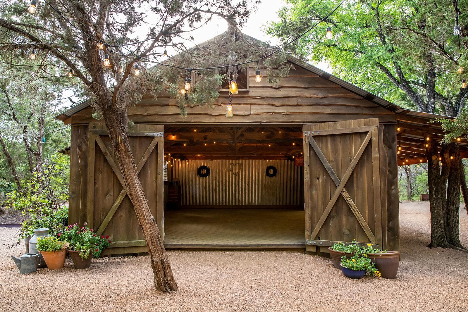 The barn is 20ft. wide by 30ft long. The other side is open to the reception area with a 10ft x 40ft long covered porch. The reception area adjoins the barn and is covered by the shade of live oaks, elms and junipers. There are two "official" ceremony sites to choose from – one features a spring wildflower field and the other, a small meadow surrounded by trees... but you are welcome to be creative and choose any space that feels right for.