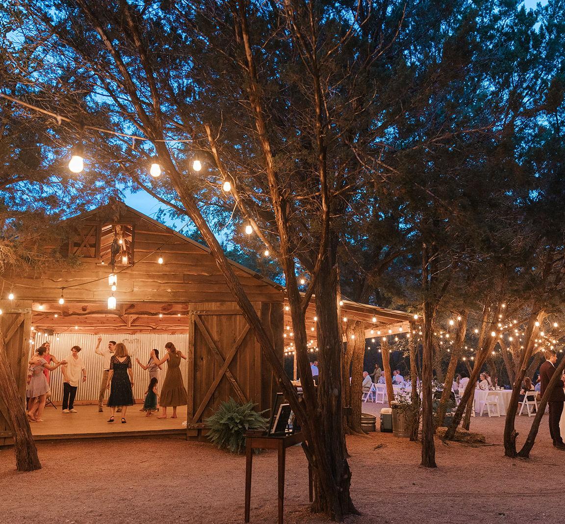 • Venue Rental for 10 hours, 1pm – 11pm (extended hours available) • Multiple outdoor ceremony options • Climate controlled dressing area • Reception under a canopy of live oaks and thousands of sparkling lights • Dance floor in the barn • Use of our built-in sound system for dinner music and dancing • Propane heater in the barn • Use of our firepit – we supply the wood! • Use your own caterer and vendors • No bartender or security required • Guest counts up to 150