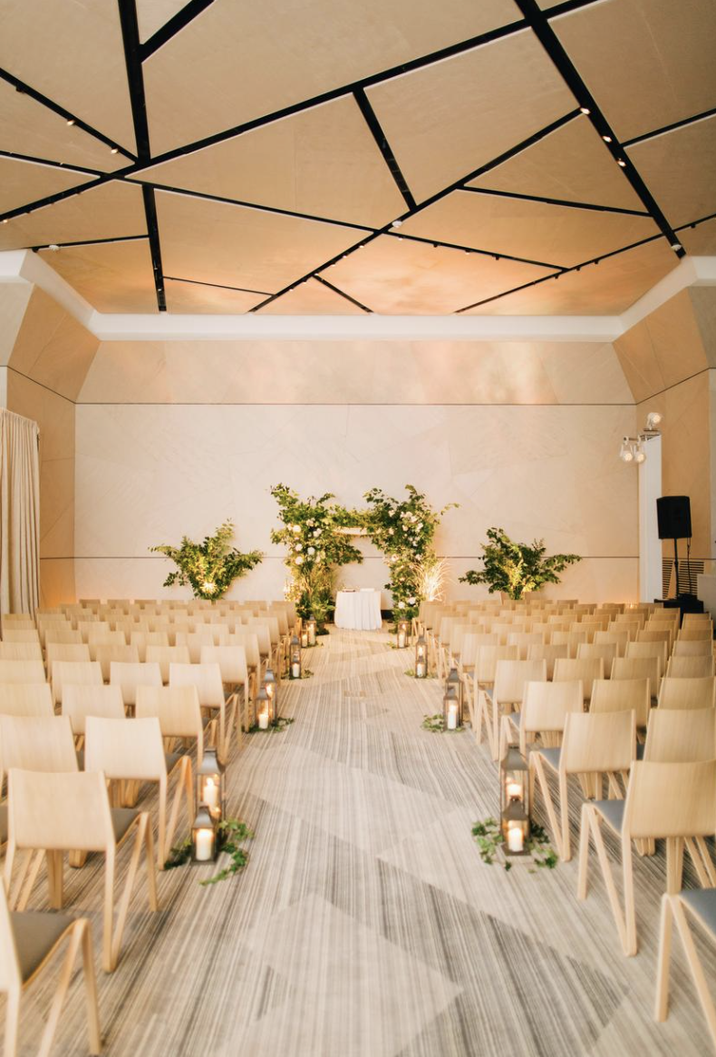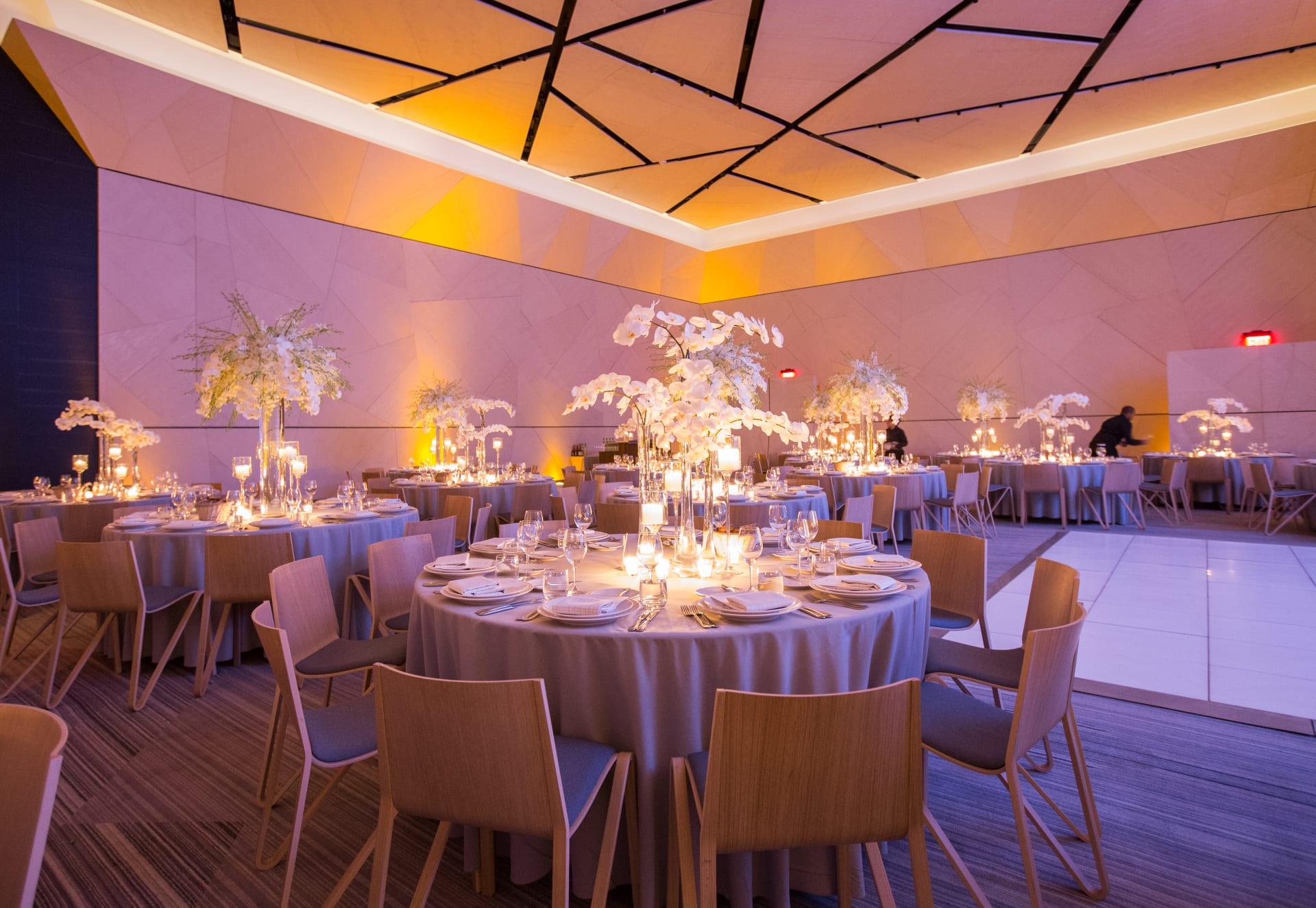 With room for 220 guests, the Vale Ballroom has a clean, minimalist aesthetic and strikingly geometric architectural details that make unique settings for weddings and receptions. The Ballroom is a modern, intimate setting for seated dinners or wedding ceremonies. Adjacent to the Ballroom, the marble-lined foyer can be added on to provide additional gathering space or private toasts, offering over 2,000 sq ft of additional space.