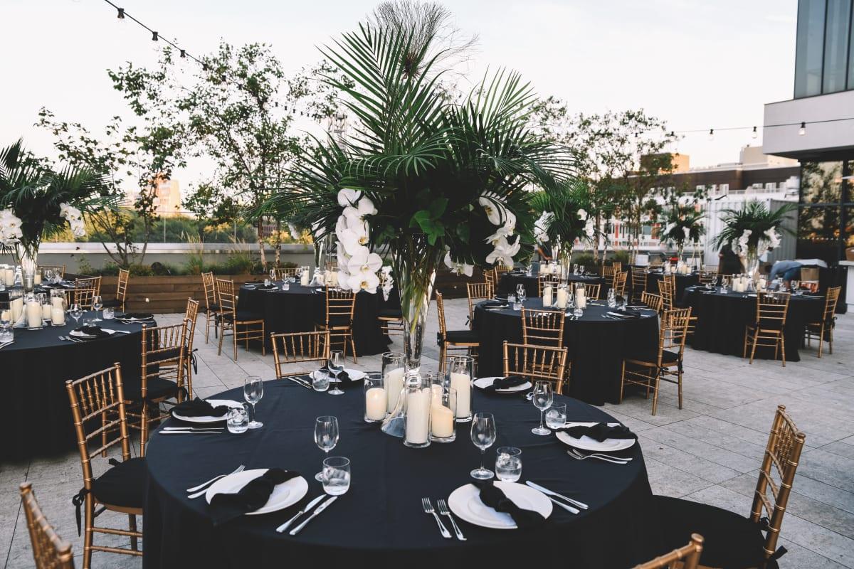 A luxurious outdoor wedding venue boasts skyline views of Brooklyn, custom landscape design, and light breezes.