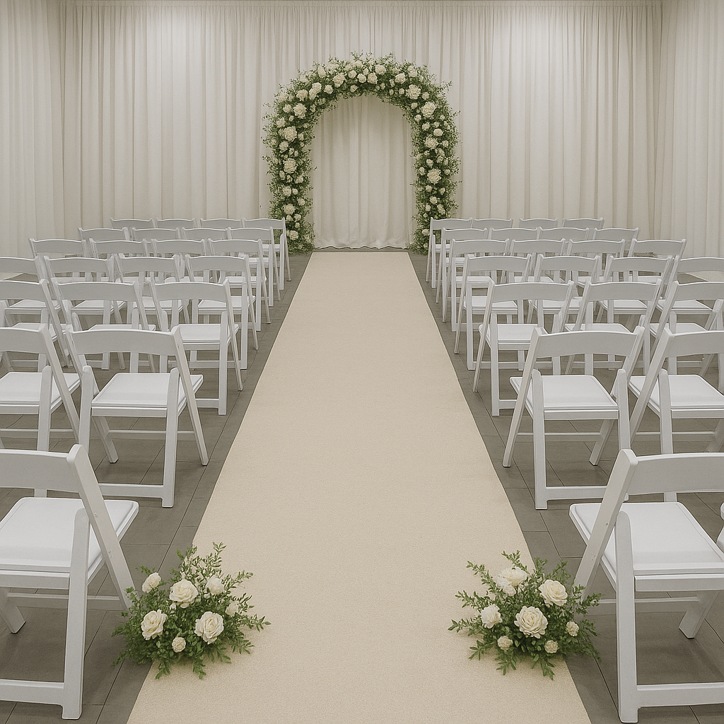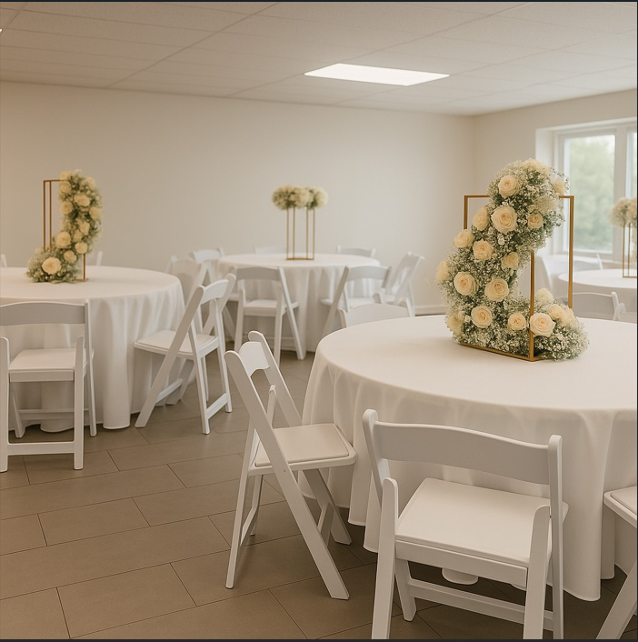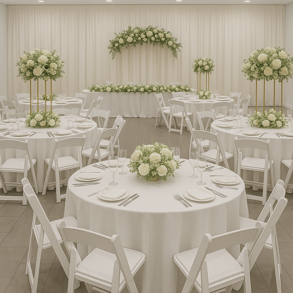 This is the essentials-only package — perfect for clients who want maximum flexibility. It includes the event space itself, along with tables and chairs. From there, clients can fully customize their event by bringing in their own décor, vendors, and add-ons.