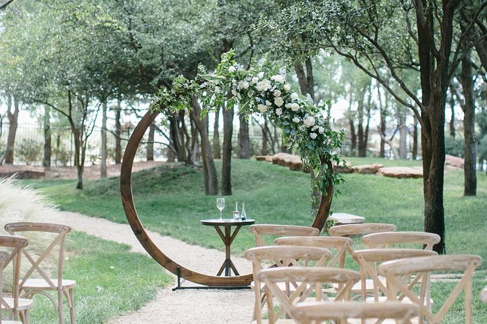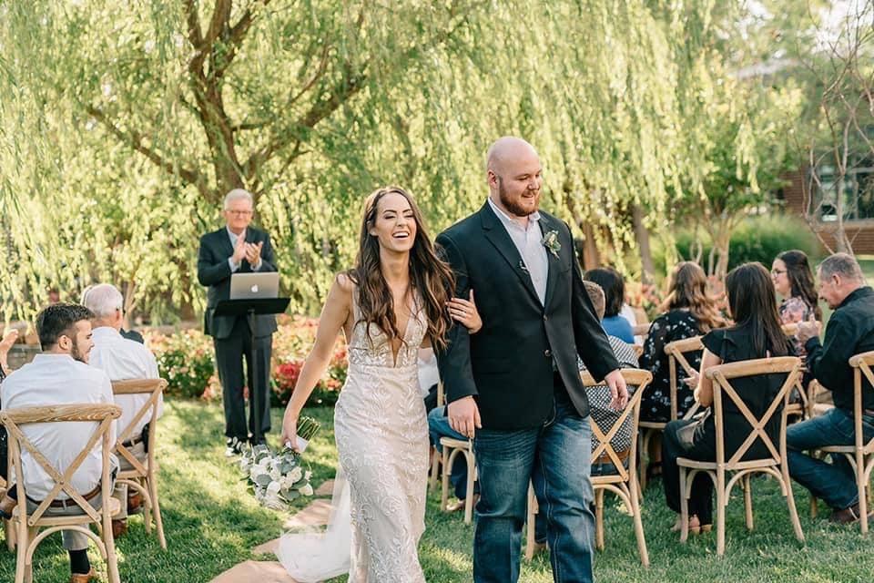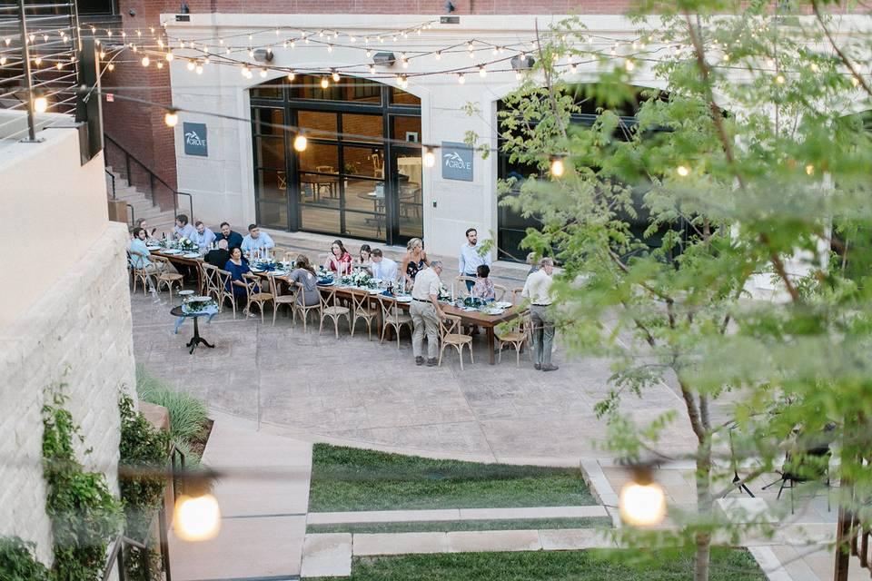 Our indoor Event Center can accommodate up to 200 guests and can be separated into smaller sections depending on the size and setup of the wedding. Our venue can host ceremonies indoors or out depending on what look you want - and the weather! It also has three overhead glass doors that open to our beautiful Courtyard. Our wooden X-back chairs can be set up for an outside ceremony in three different ways: facing the bell tower, the cascading wall of ivy, or the waterfall. You can also dance the night away under the twinkling lights after saying “I do!” Up the stairs by the bell tower is a beautiful garden that you and your bridal party can use for photos throughout the day. This is also where our beautiful Bridal Suite is located. Our Garden is also utilized for a one hour cocktail/social hour in between the ceremony and reception.