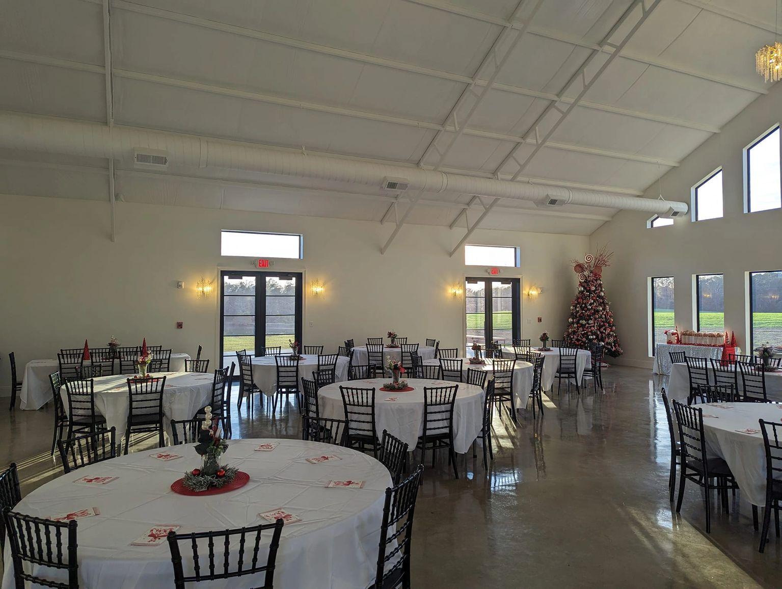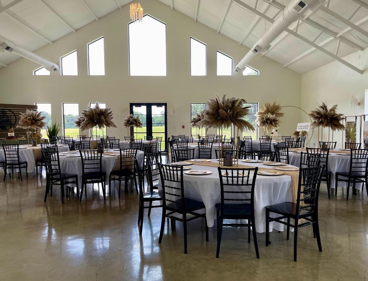 - Bar - 10 round 72 inch tables - 5 rectangle 8 ft tables - 6 tall boy tables - All white linens