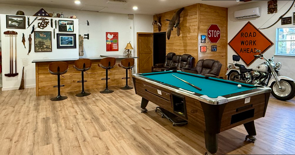 Funny groom suite includes a bar with barstools, pool table, bathroom, mini fridge, and microwave.