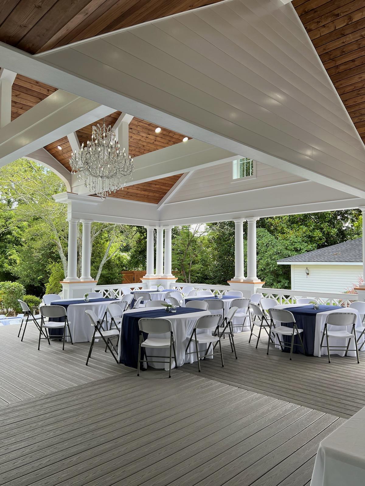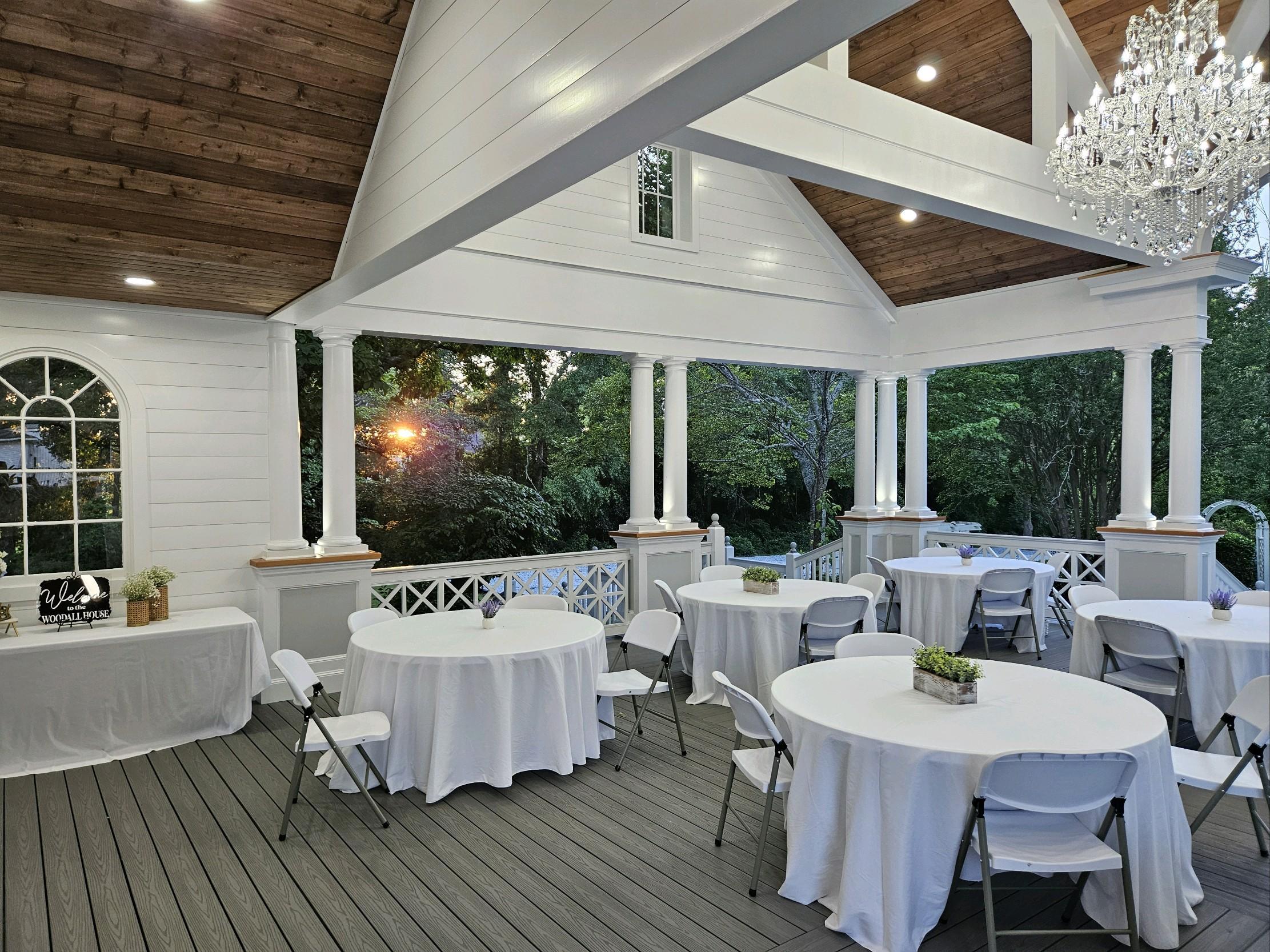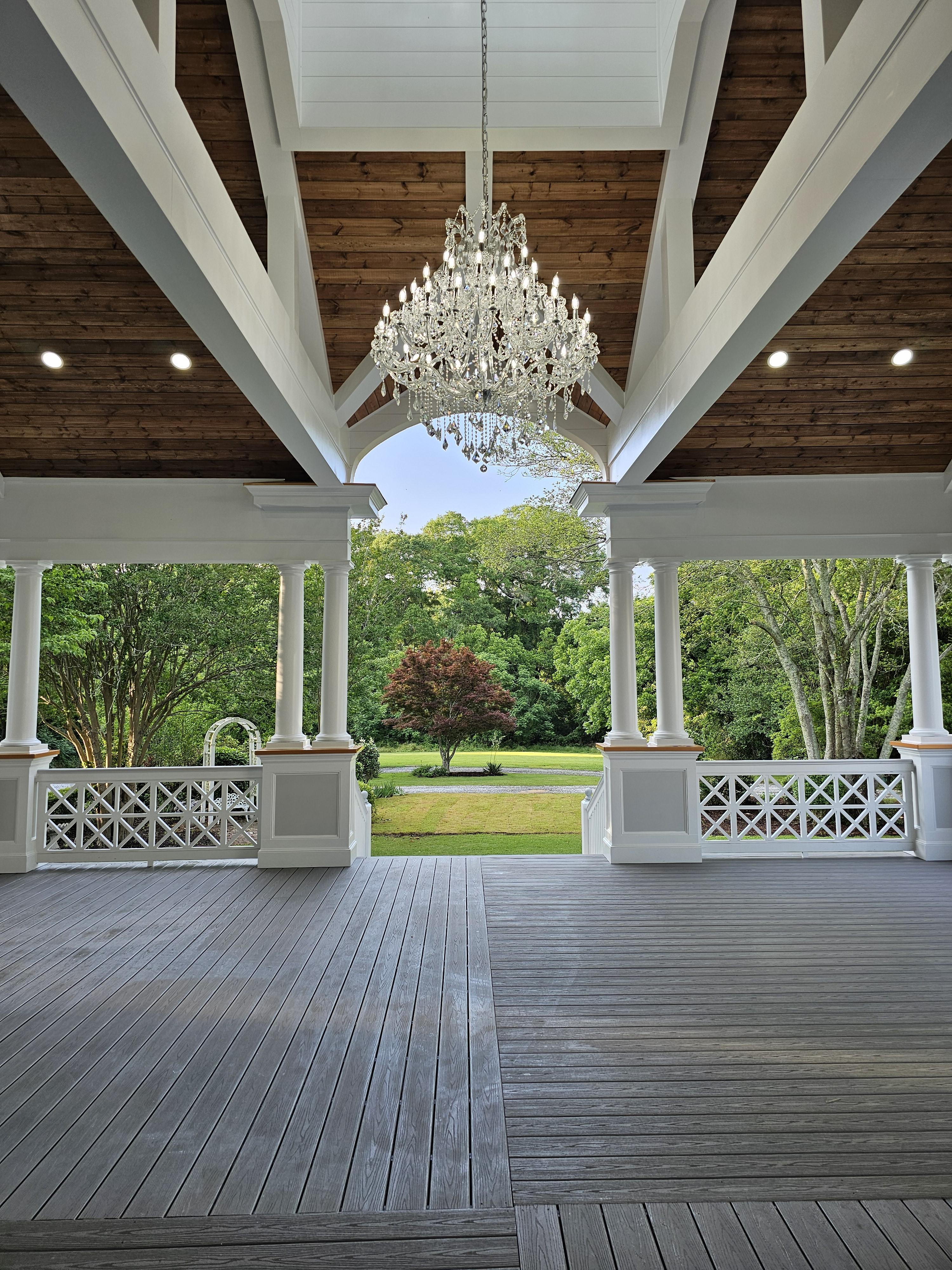 This elegant event space blends timeless charm and modern sophistication, perfect for weddings. A grand staircase leads to an elevated pavilion adorned with stately columns, intricate latticework, and a stunning chandelier. The vaulted wooden ceiling and soft lighting create a warm, inviting ambiance. Surrounded by lush greenery and manicured lawns, the open-air design offers versatility for any occasion, combining beauty, functionality, and unforgettable atmosphere.
