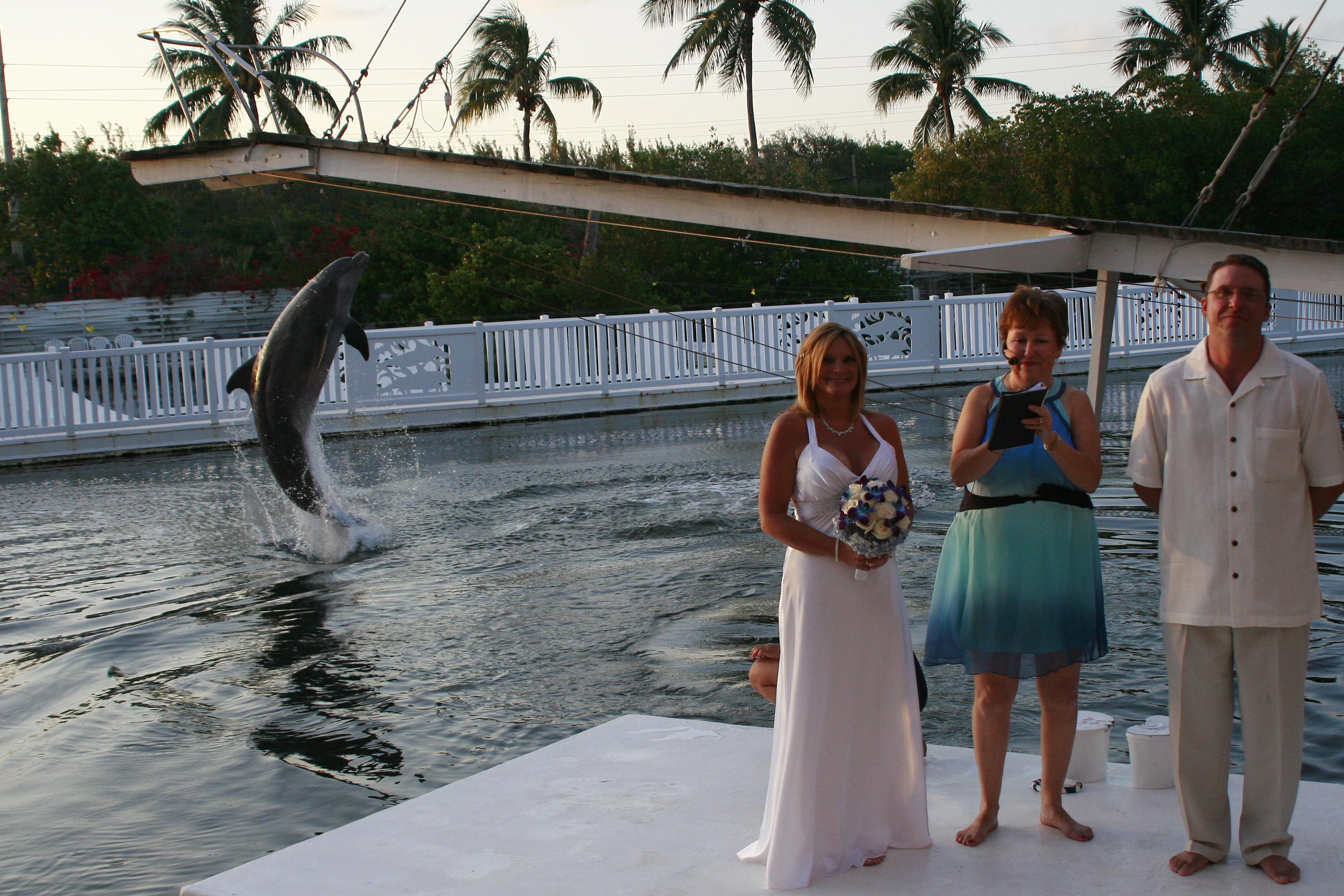 The experience was truly unbelievable. We were married in the water with Dolphins. Two dolphins brough two of our daughters to the beach area. The remaining wedding party was in the water at the beach. We have seven children and two grand kids. The folks at Theater of Sea warned us the dolphins maybe shy and not perform. They loved all the attention. We had nearly 120 folks and it was great, everyone still talks about it. Beautiful walkways and a wedding boat arrival after the ceremony.