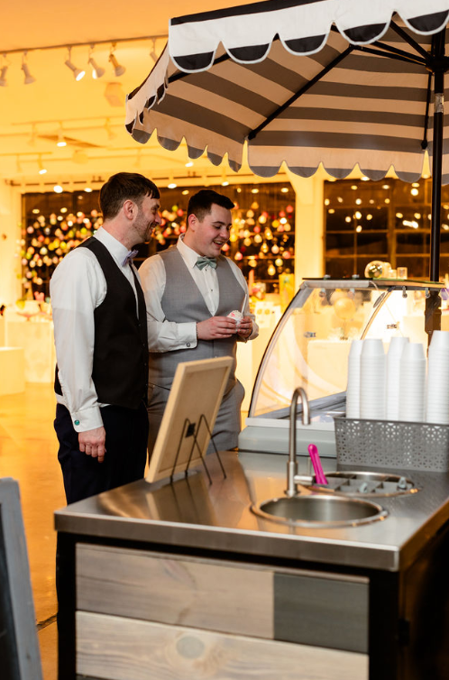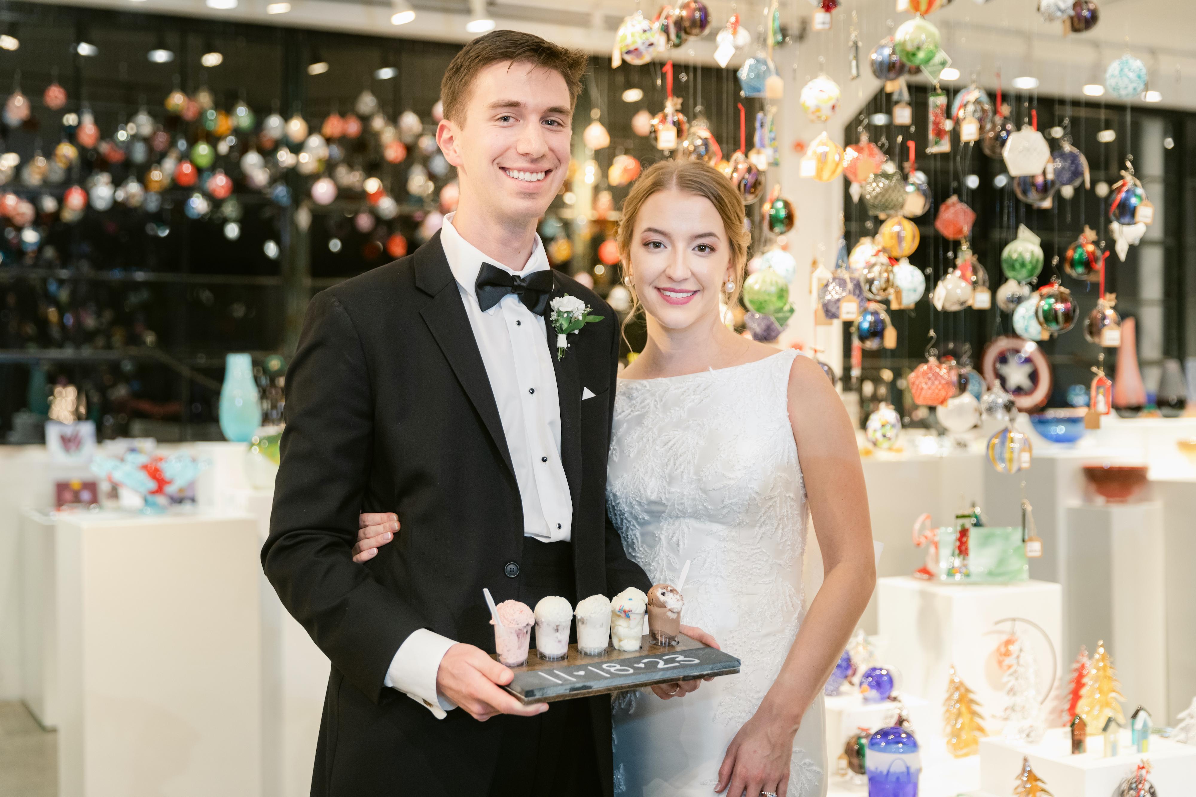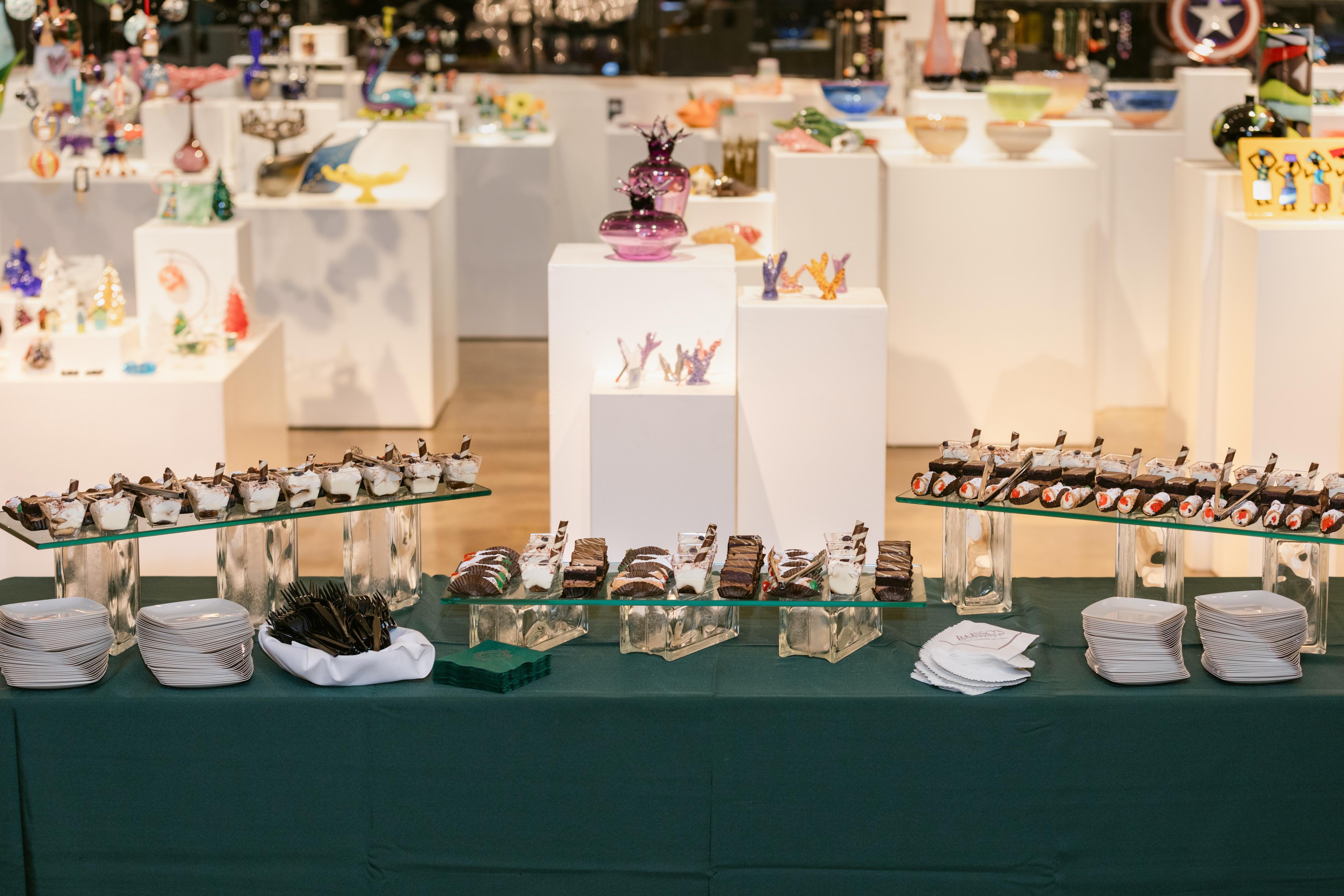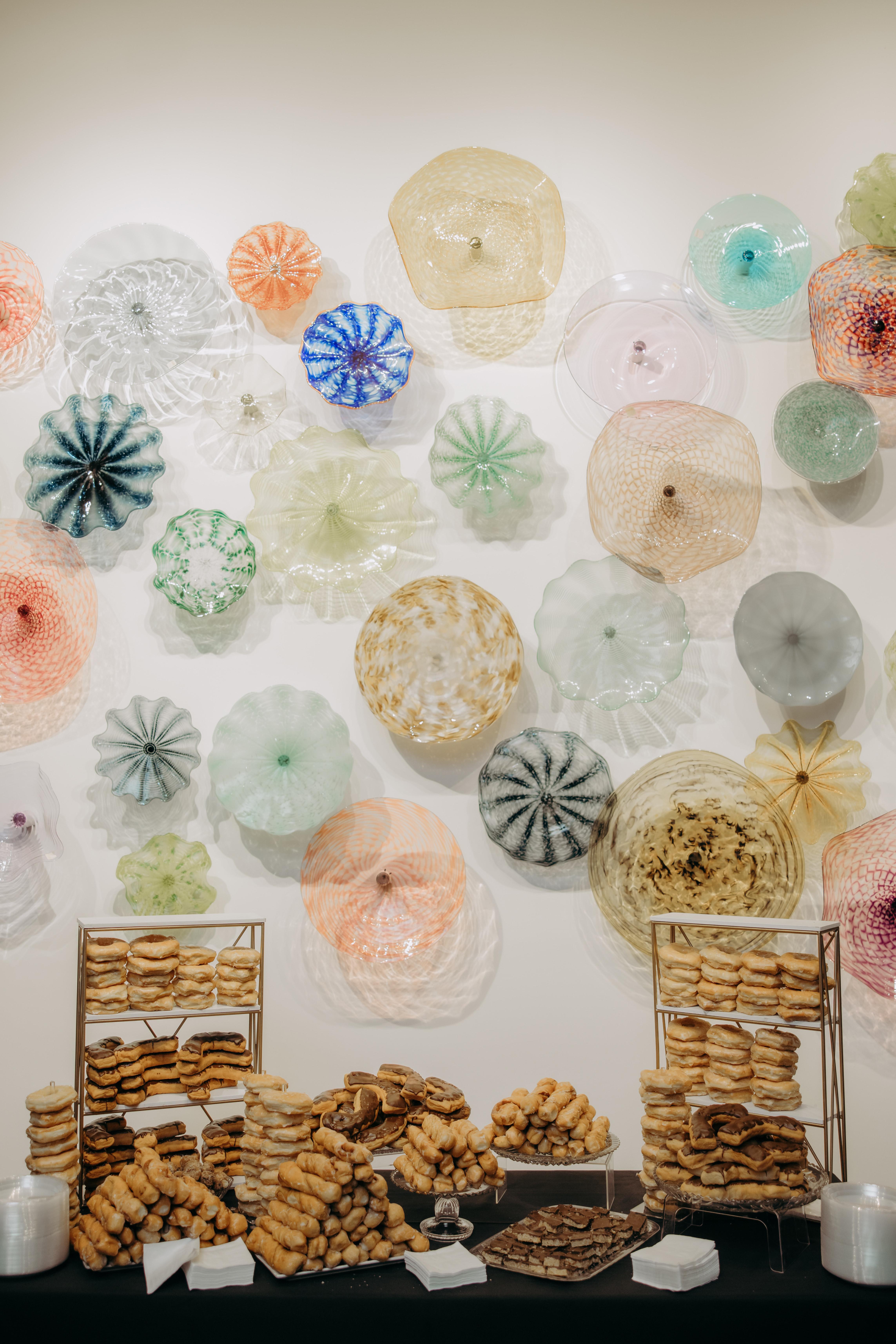 Host your rehearsal dinner, cocktail hour or ceremony in the Glass Gallery and have your guests surrounded by striking glass pieces by our TDG artists. It's also a gorgeous setting for your wedding cake or late-night snacks. The gallery is separated from the hot shop by a wall of floor-to-ceiling glass; add a glassblowing demo to your wedding & guests can watch as they mingle and grab a drink.