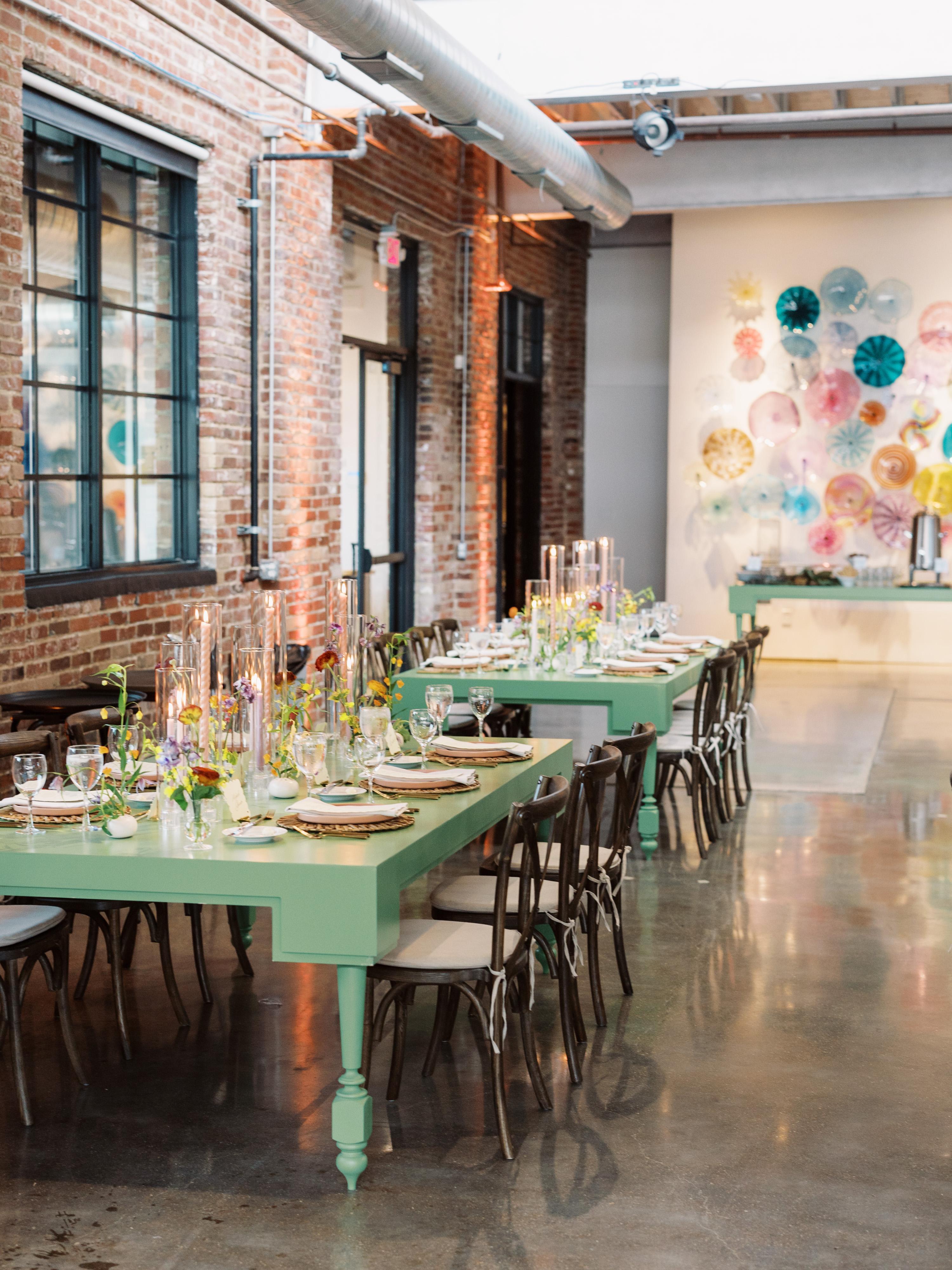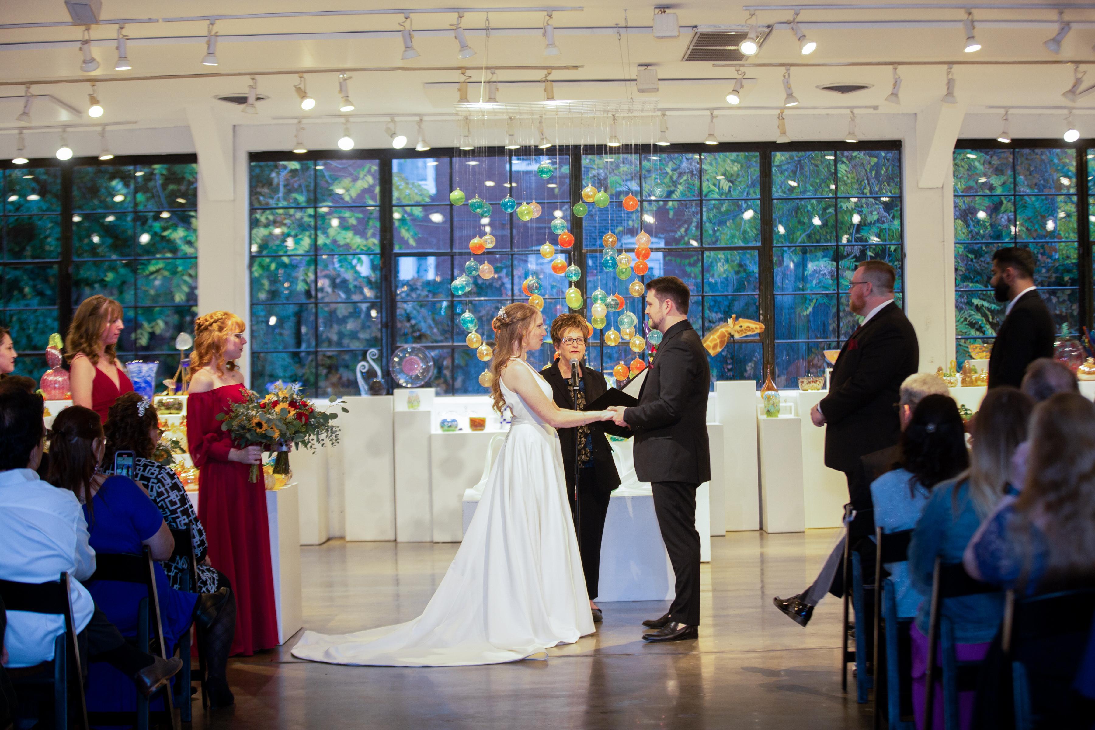Not every couple will have handblown glass pieces in their wedding photos! Our East Gallery is an unforgettable space for weddings with numerous photo opportunities. Customize as much or as little as you want; the space makes for a beautiful ceremony and reception venue as is with exposed brick and oversized industrial windows. A large brick and glass bar stands at one end, and there is plenty of room for a spacious seated dinner and dance floor.