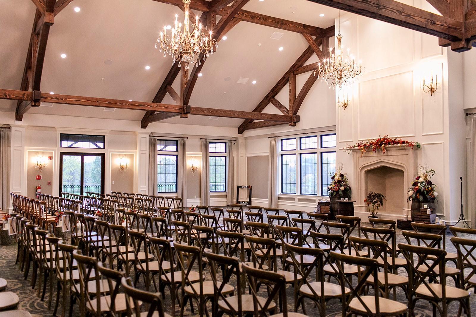 Timber Banks ballroom has 22ft high ceilings framed with timber beams and fireplaces on each end of the ballroom. Each couple works with a designated event planner who helps bring your vision to life from your timeline, food & beverage offerings and floor plans and will be there on the day of your event.