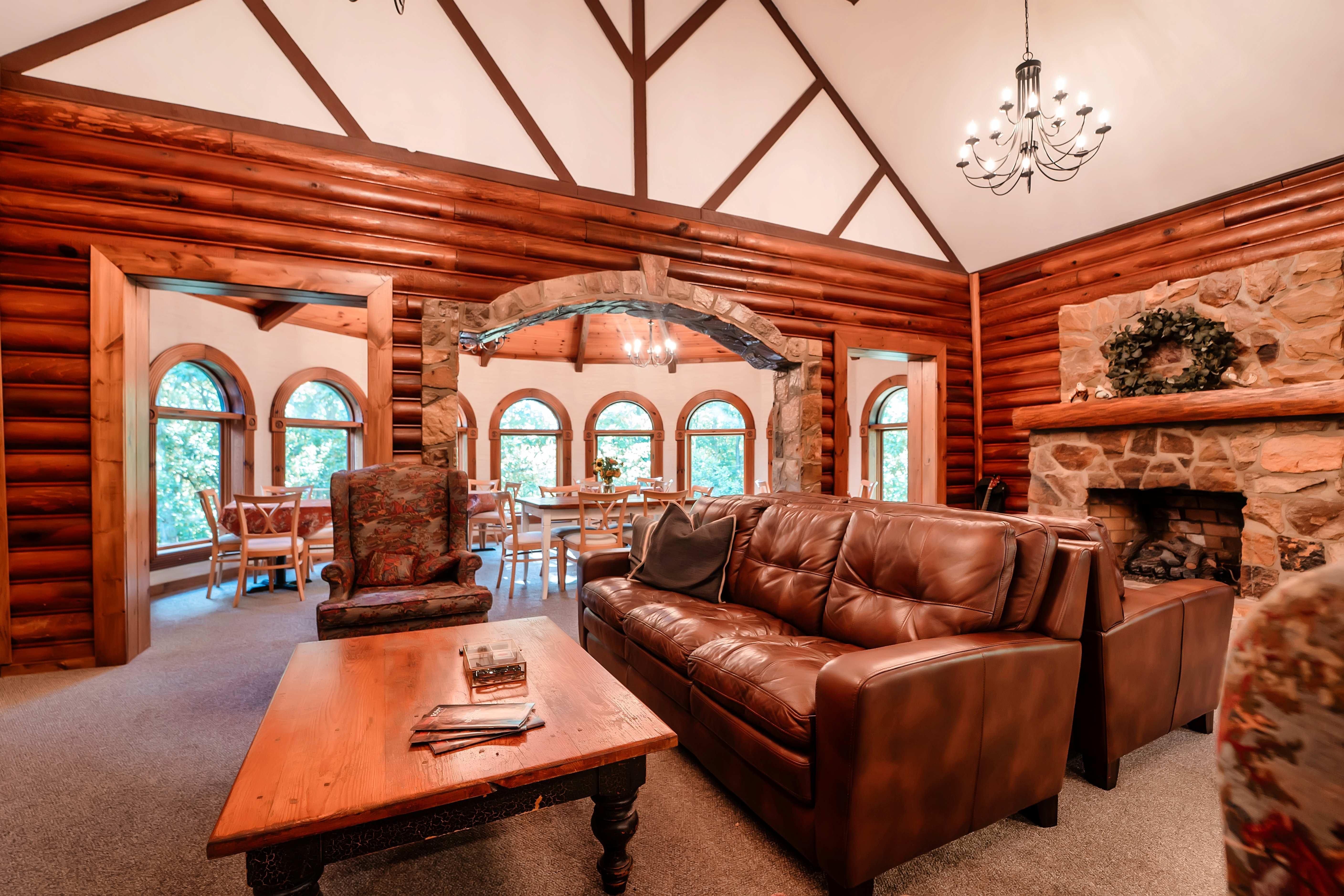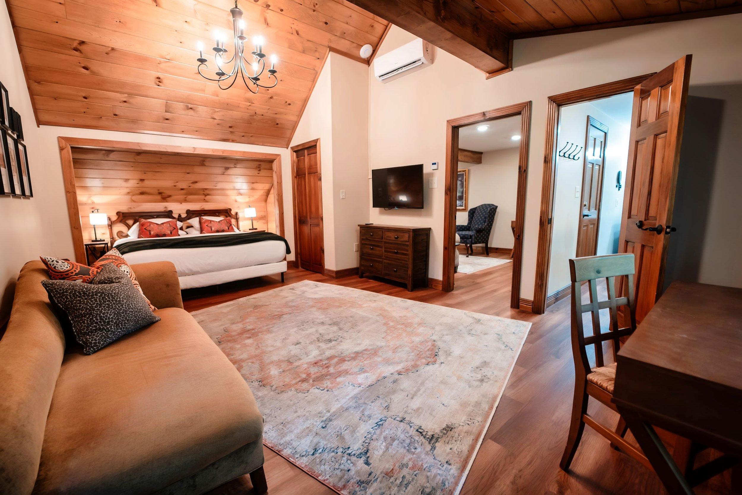 The Conservatory is a beautiful and unique western exposure room featuring a stunning half round windowed area with a fieldstone archway, log walls with stucco and half-timber accents, chandeliers, beamed ceiling and a stone gas fireplace. It’s a large space that can feel very intimate. It’s a respite for you, your family and friends to gather and visit throughout their stay. Think of it as you family’s living room – comfortable and accommodating. (With a large screen TV!)
