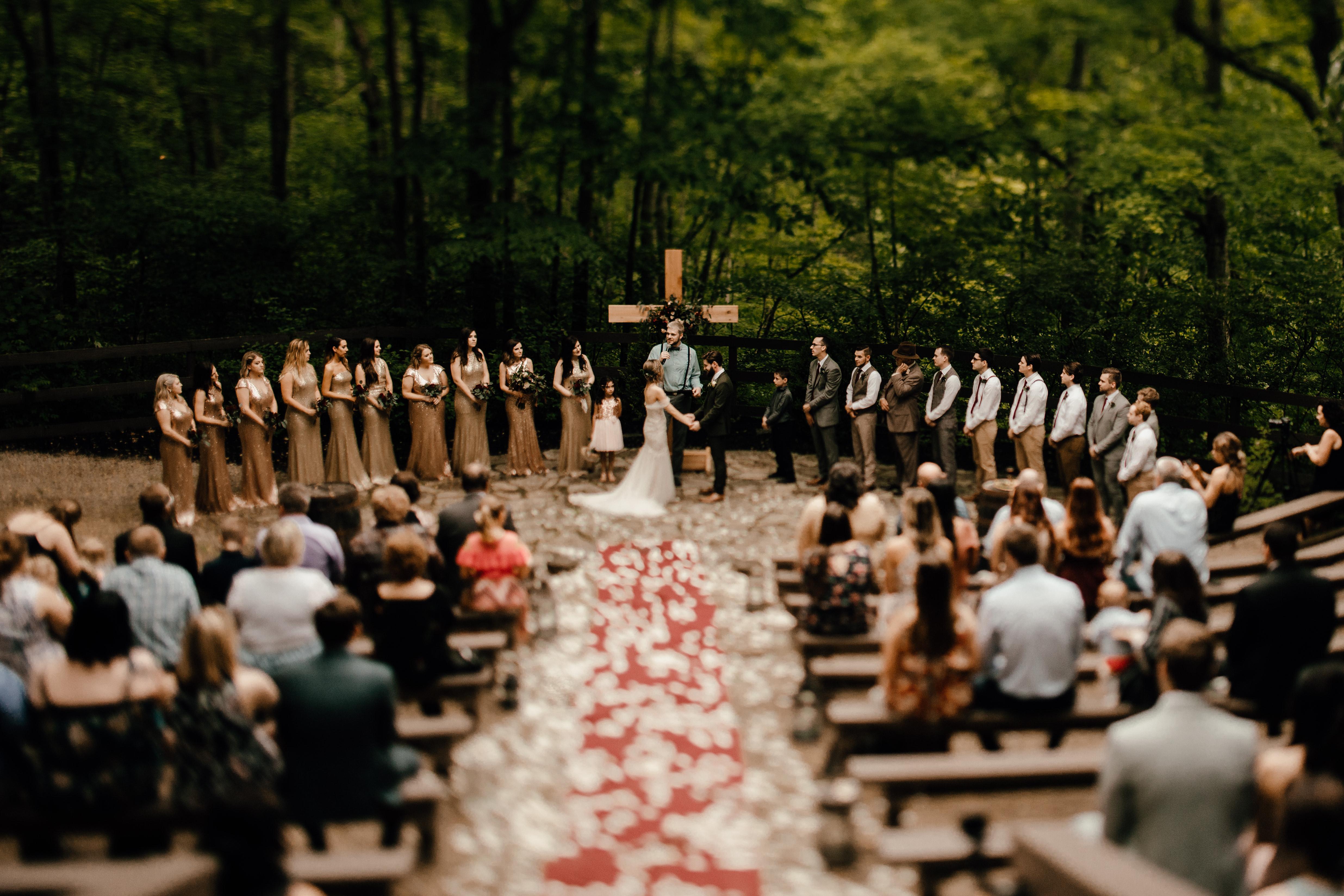Timeless Charm Weddings is set on 83 beautifully wooded acres in Southwest Ohio, a short drive from Dayton or Cincinnati. We have many unique sites including a swinging bridge, beautiful waterfall, magnificent stream, natural spring fed pond with fountain, and a majestic forest canopy. You can say your “I dos” at one of two amphitheaters, or in our charming open-air chapel. The Grand Lodge boasts a floor to ceiling fireplace, chandeliers, and a beautiful wood and stone interior. Outside you’ll find a covered pavilion perfect for cocktail hour and a relaxing firepit as your day winds down. Our open-air Waterfront Veranda is perfect for couples who wish to remain immersed in an outdoor, intimate setting. Illuminated by elegant lighting, your celebration will continue at the dockside bar with stunning views overlooking the water. We offer on-site lodging at one of our many beautifully appointed chalets. Ideal for bridal parties, out of town guests, and family.
