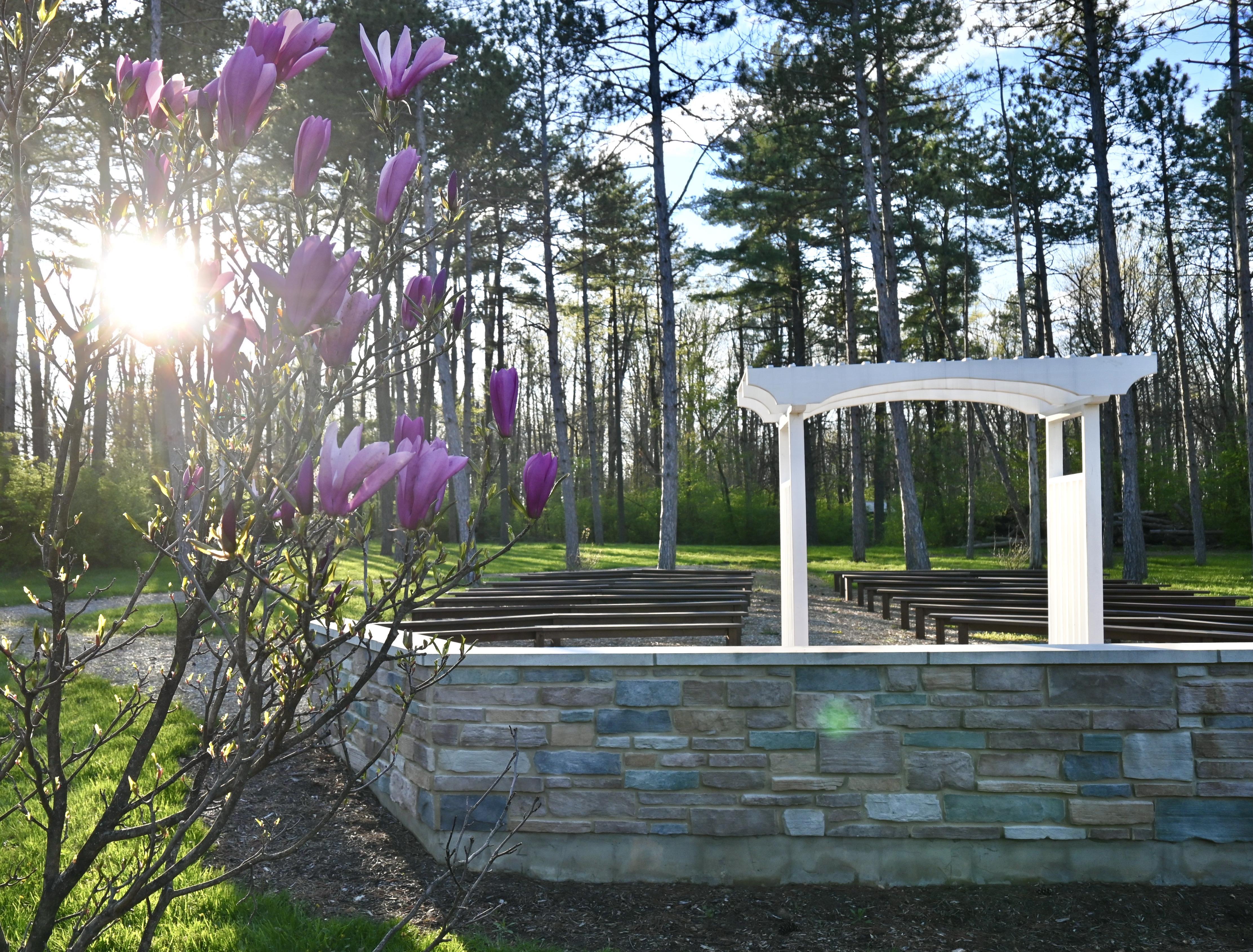 Our serene amphitheater is surrounded by pine trees and beautiful flower. With a paver path and surrounding flowers, It's one ceremony site you will never forget.