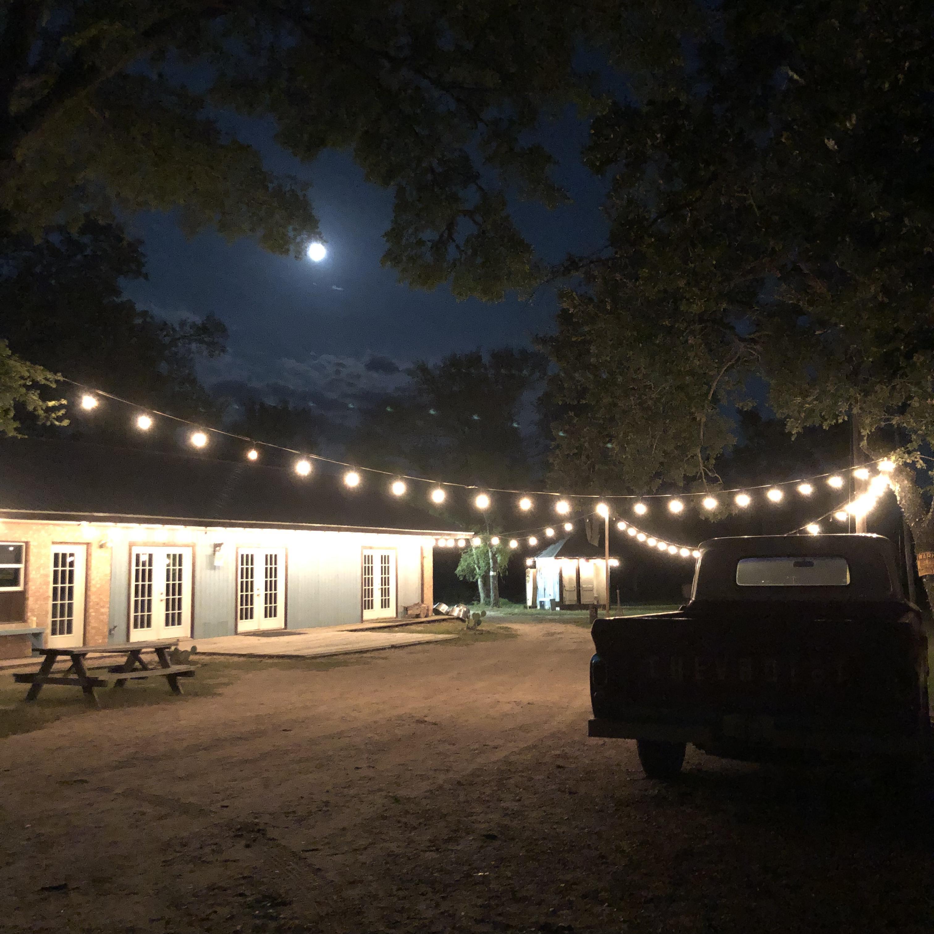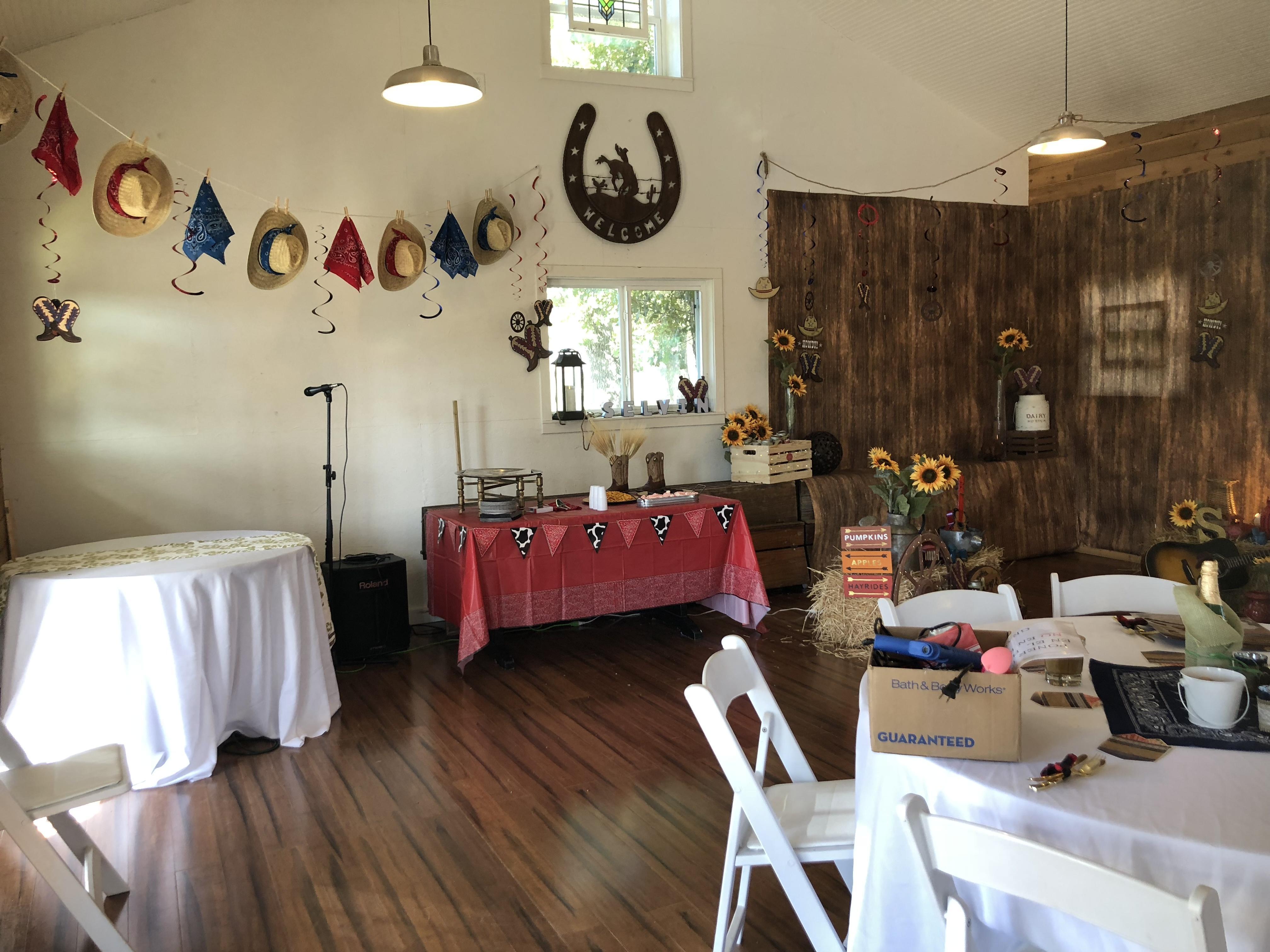 This is a DIY space. We do have twinkle lights installed on the ceiling beams. You can rent our tables and chairs or bring your own. There’s an old school stage that you can use or fold up for more space. It is very basic. You make it what you want.