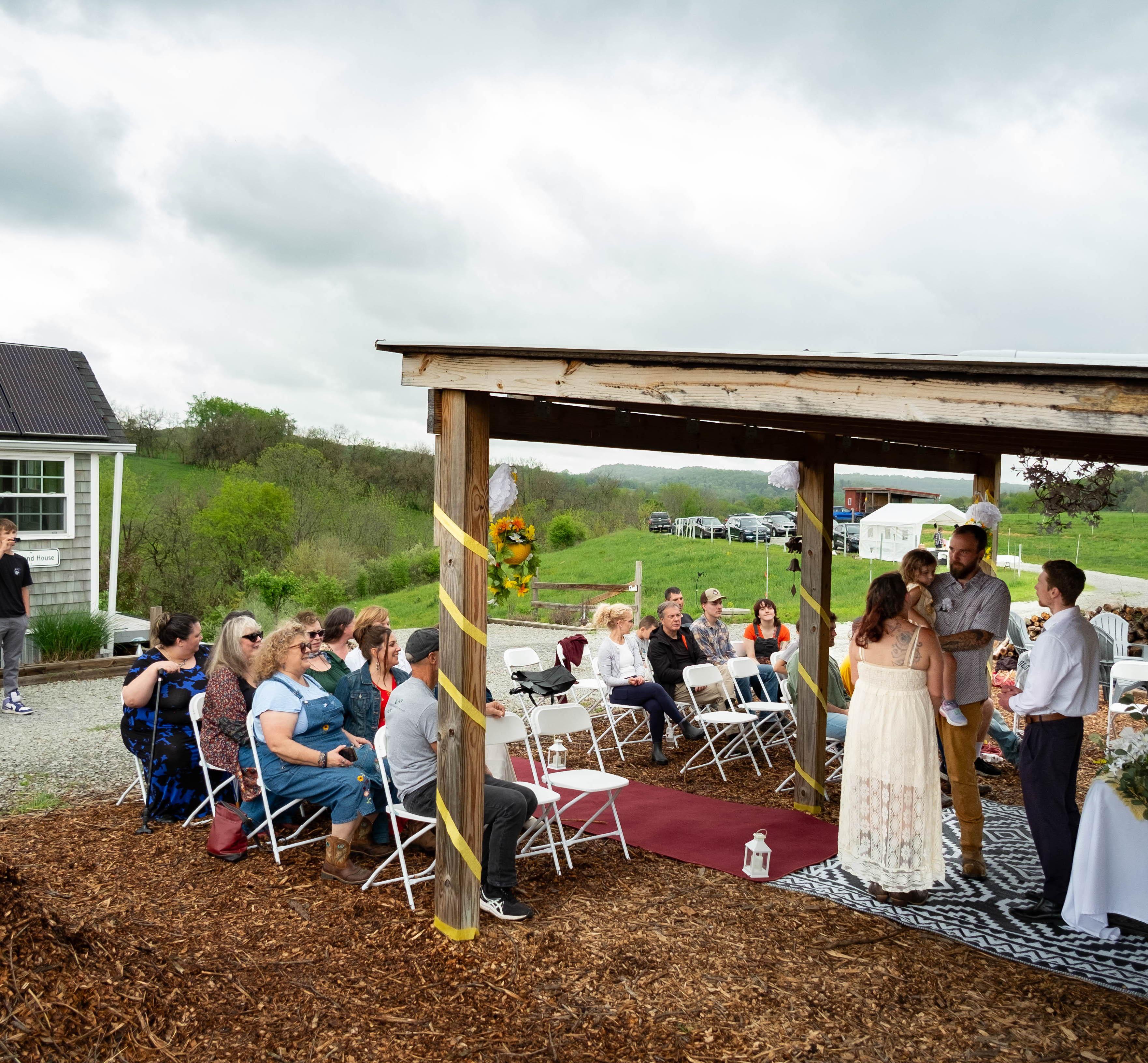 Tiny Venue features a covered picnic pavillion, outdoor porta-john and hand wash station, solar lights, plus use of: Campfire Pit with Split Logs, Adirondak Chairs, Horseshoe Pit, Picnic Table, Gas & Charcoal Grills, On-site Field Parking, and Parking Signs.