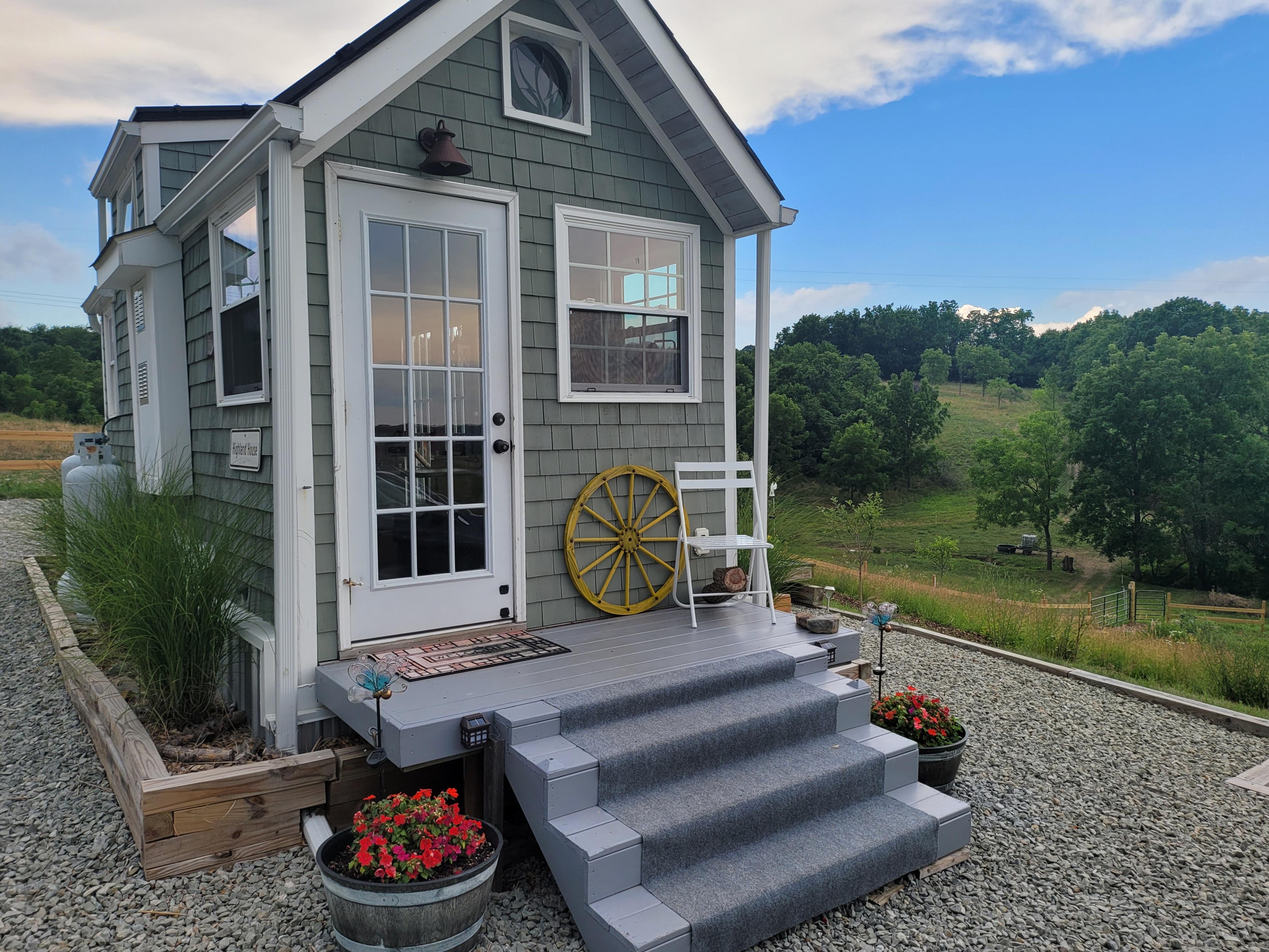 One night stay at Highland House - "Glamping" with all the amenities of home! Complete kitchen with stove, oven, sink and fridge, copper pots, pans, dishes, flatware, teakettle & a French coffee presses. Living room sofa opens to a comfy double bed. Linens & pillows are stored underneath. A gel mattress Queen bed is up the telescoping ladder in the sleeping loft with extra linens. Bathroom with farm bucket sink, shower, mirror, lights & composte toilet. Towels and bed linens are included.