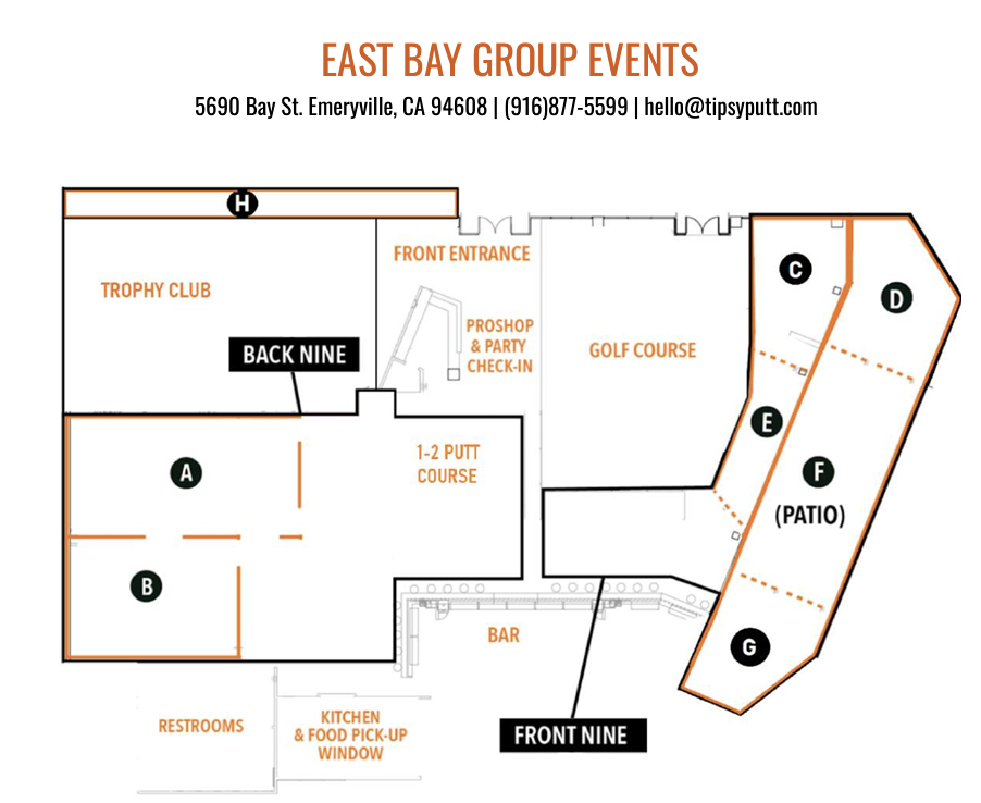 Dedicate all or half of Tipsy Put to your party and guest when booking a 1/2 or full pub buyout. From colorful murals of the Bay area, neon signs scattering the pub and replica of the Bay Bridge on the golf course, there are ample photo opportunities to commemorate your special day. Challenge your friends to a game of Giant Jenga, Connect 4 and Cornhole, enjoy unlimited plays of mini golf and 1-2 Putt and explore this modern atmosphere of our East Bay pub.