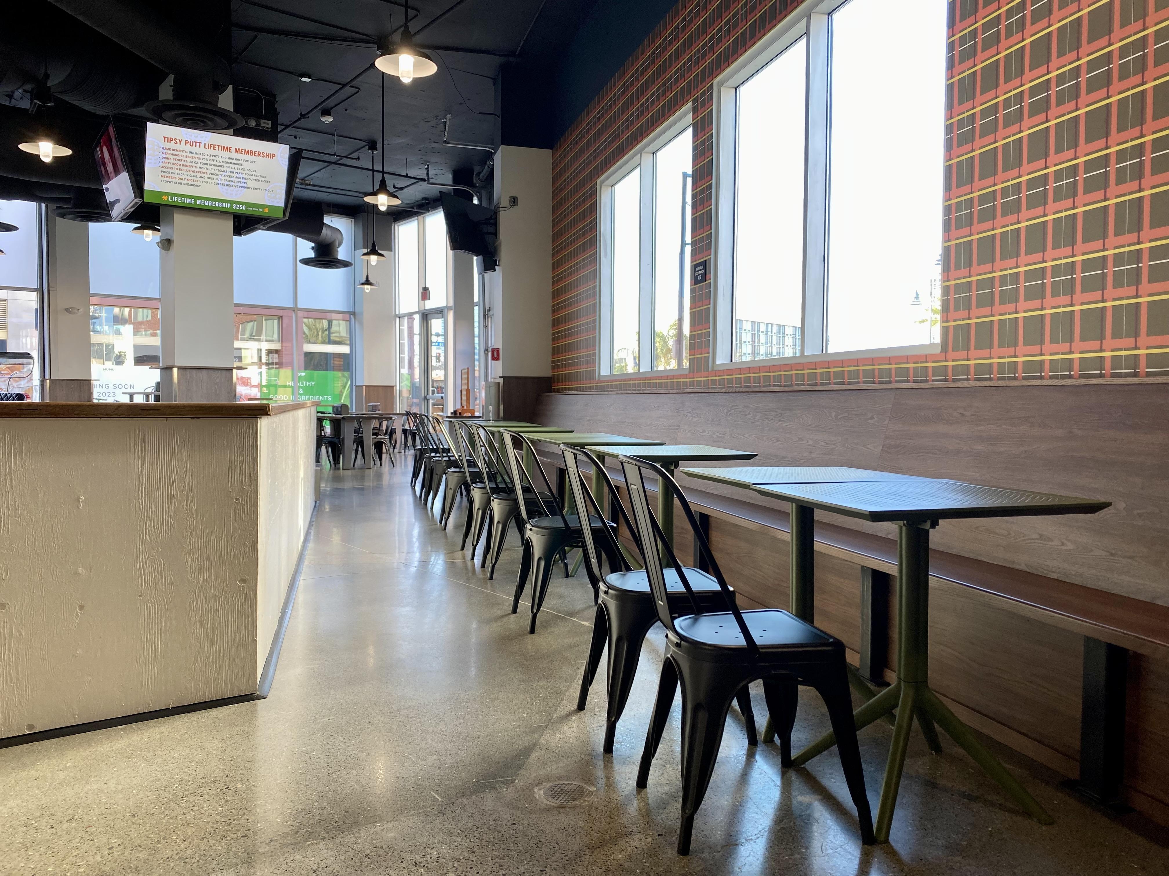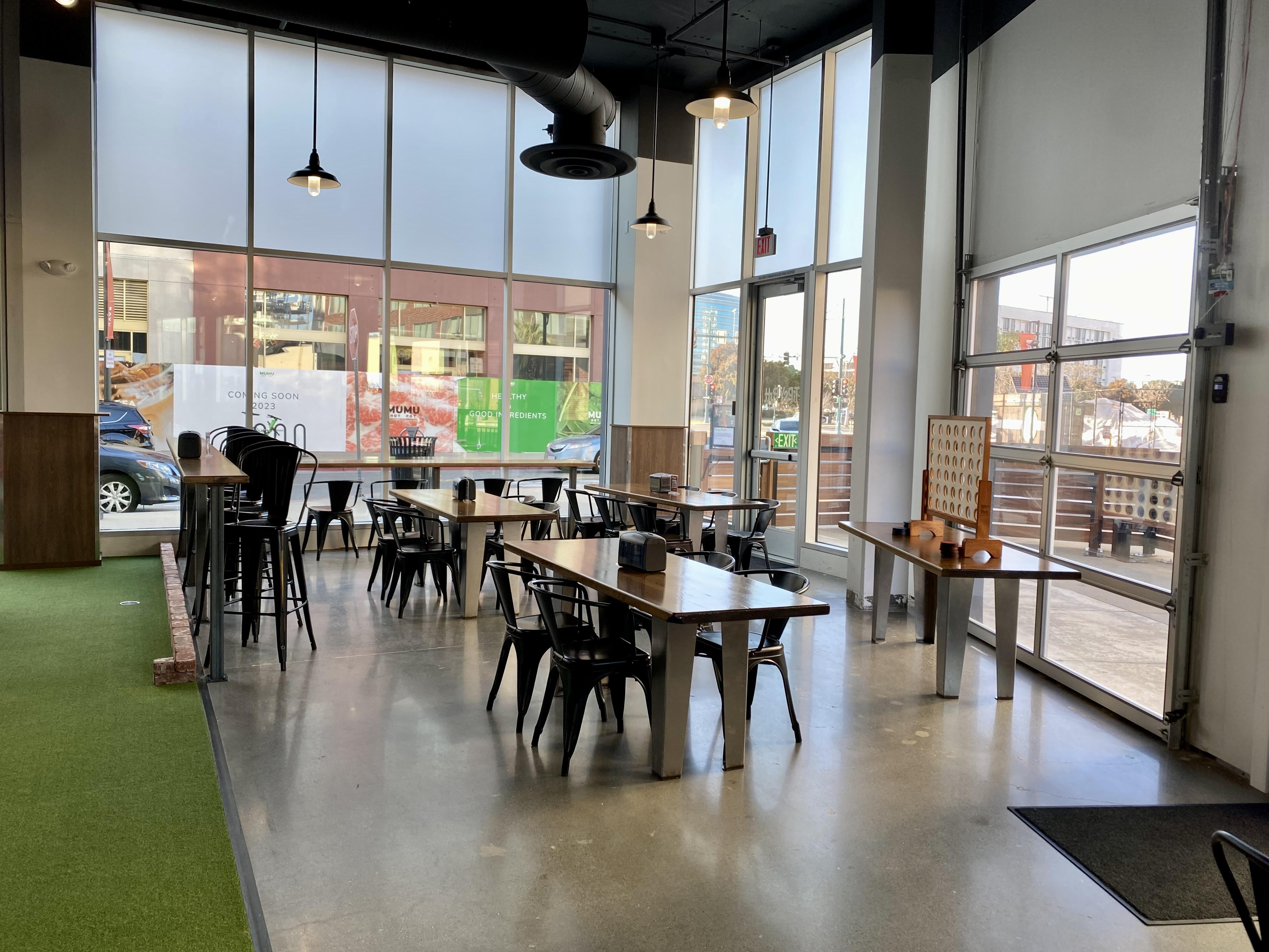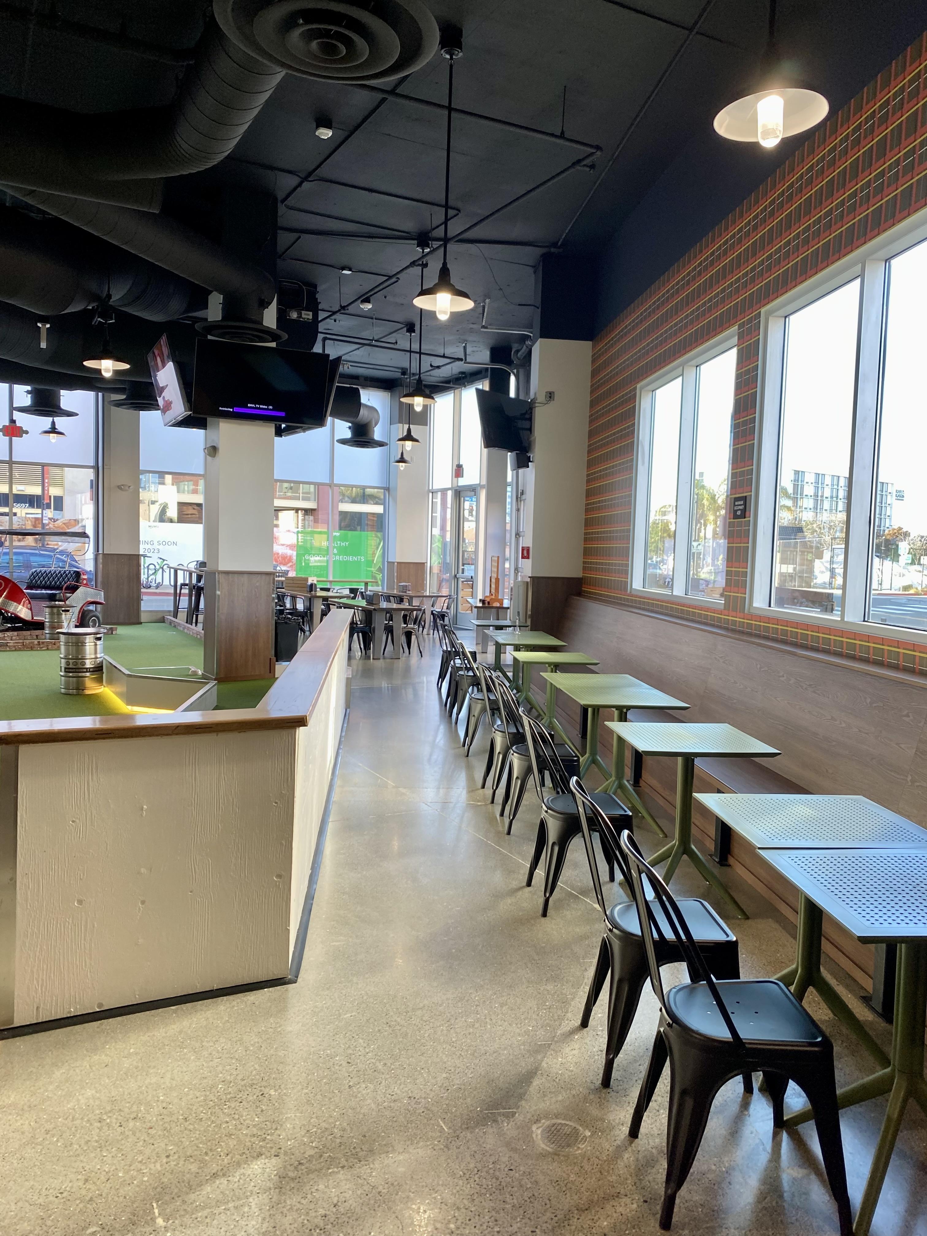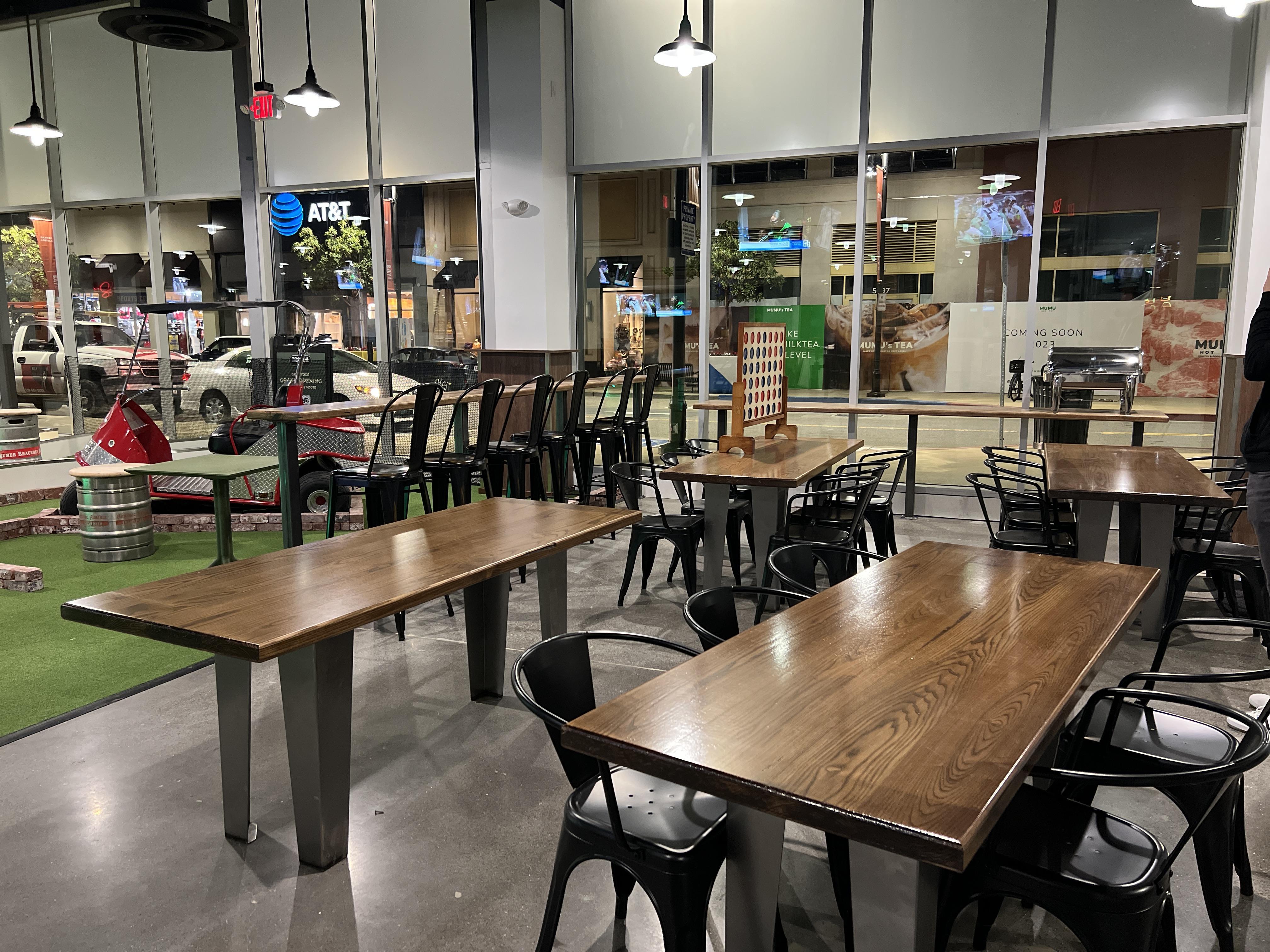 This space is perfect for smaller gatherings looking to a casual, intimate celebration. With bench and table seating, your guests have the option to stand or sit as they interact with each other. During the daytime, the sun provides a beautiful amount of sunshine and when it gets a bit chilly, we have tall heaters to keep your party comfortable. This space offers you and your guests quick and easy access to our mini golf course through our urban garage door.
