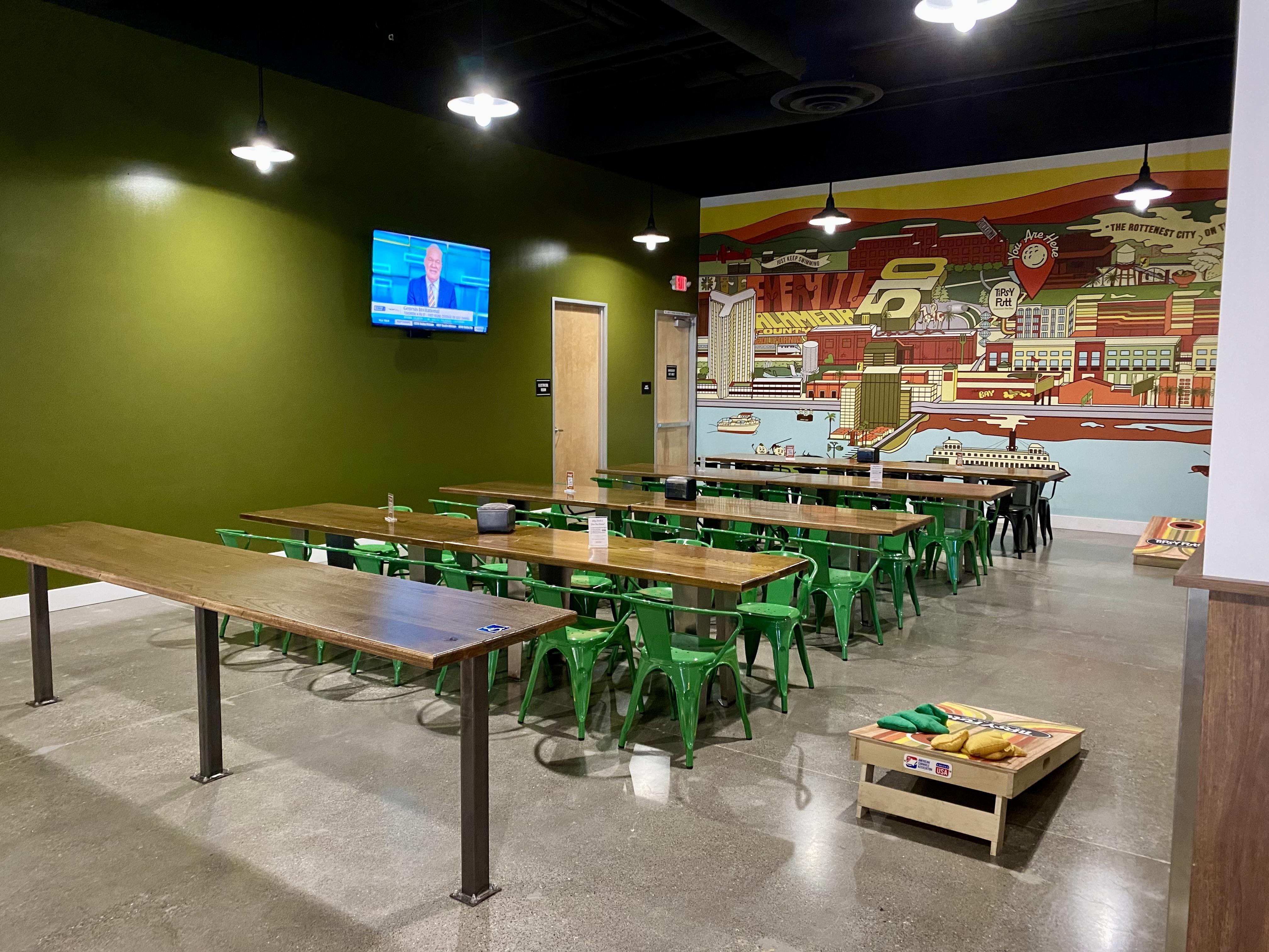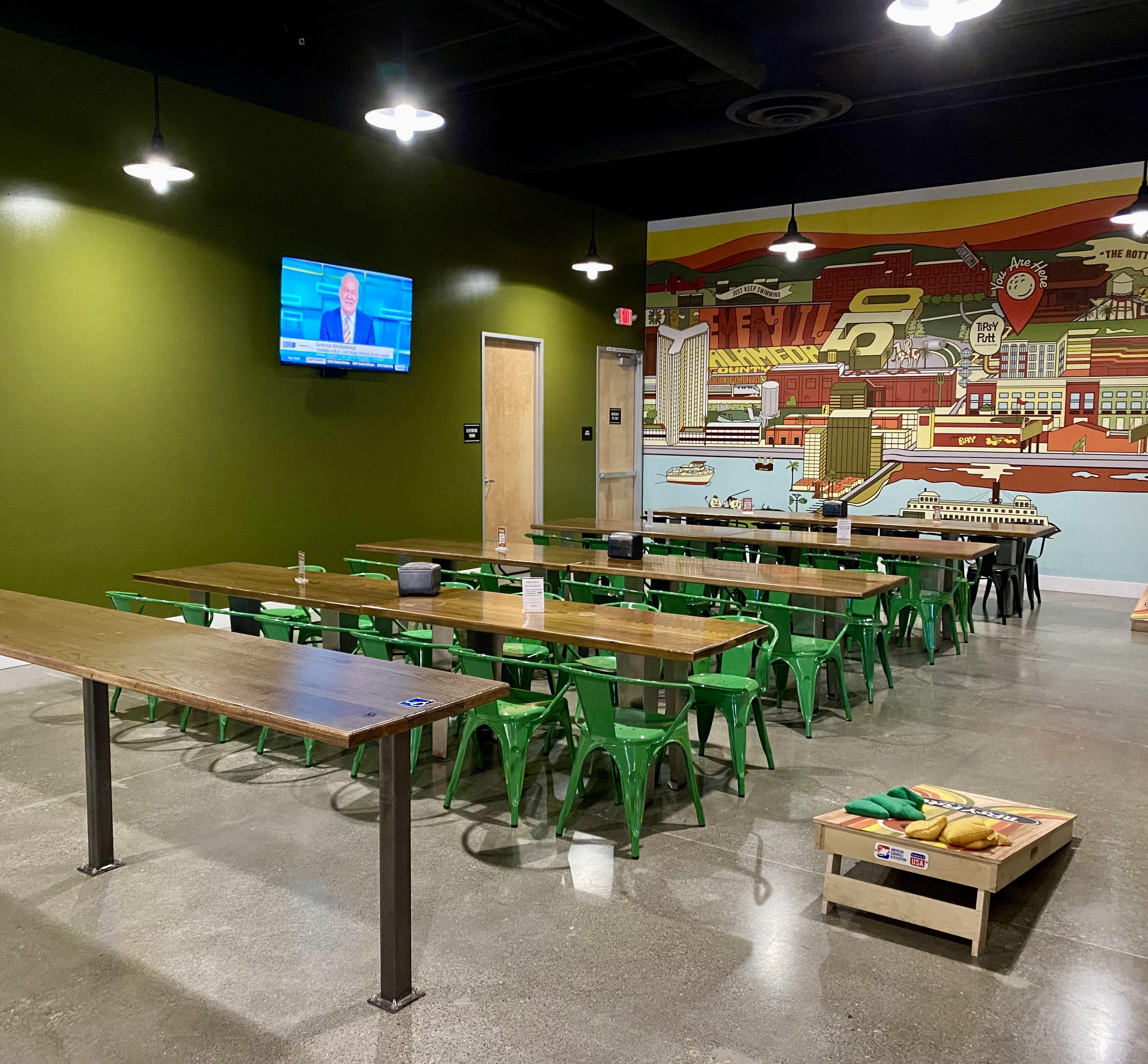 This space combines both the Happy Gilmore and Chubbs Peterson spaces, giving your party access to both indoor and outdoor settings. Your guests will have plenty of room to walk around comfortably as they interact with eachother and have options for comfortable seating. The Green offers easy access to our mini golf course so your party can go back and forth with ease. Cornhole can also be setup within this space for those enjoying the outdoor patio
