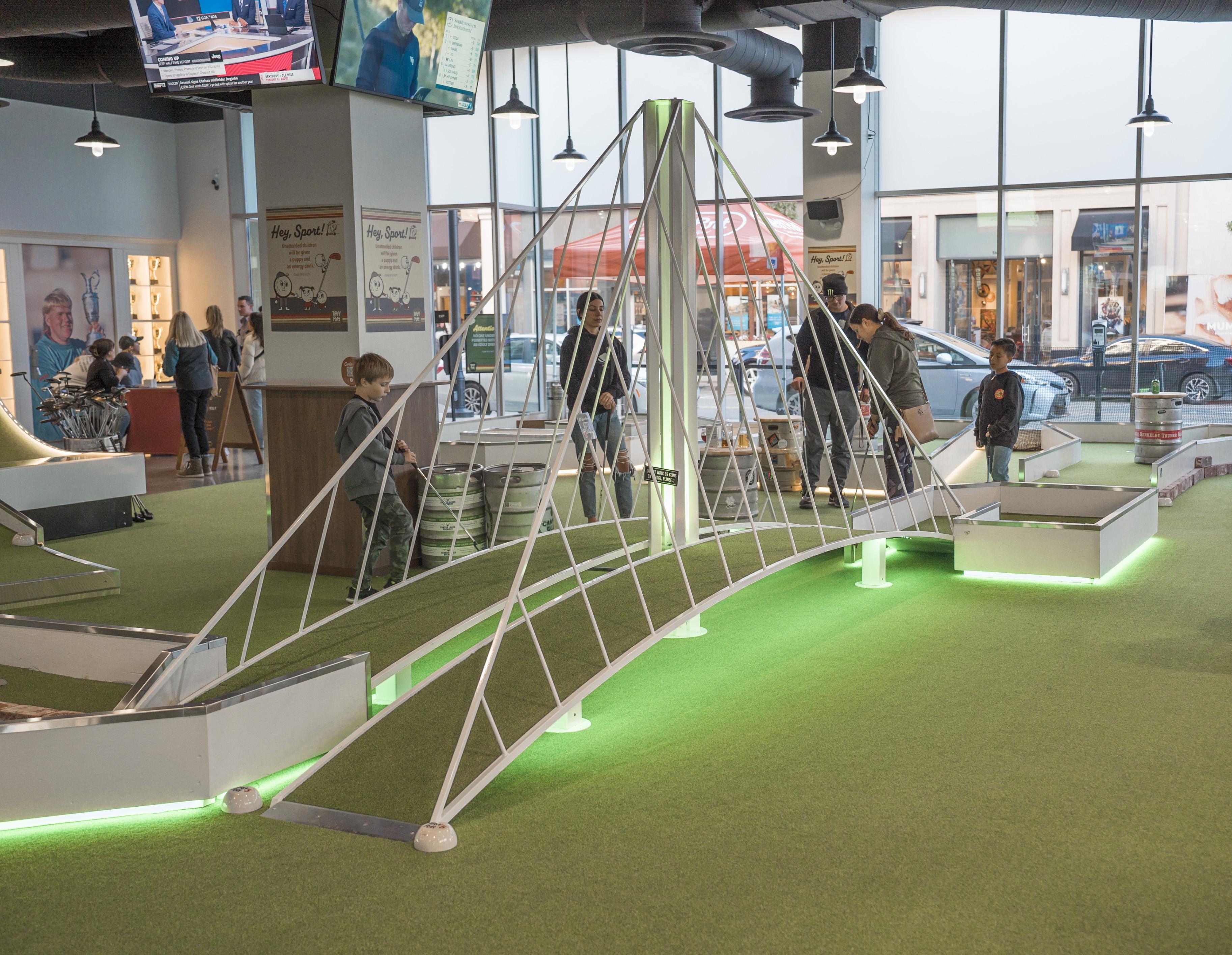 Nestled in the front corner of our pub and surrounded by large windows, this space gets an amazing amount of sun and offers an urban and casual style to your party. The Happy Gilmore space is directly next to our course with a replica of the Bay Bridge, so your guests can easily challenge each other to a friendly round of mini golf. When the weather looks inviting, step into our outside patio for a breath of fresh air.