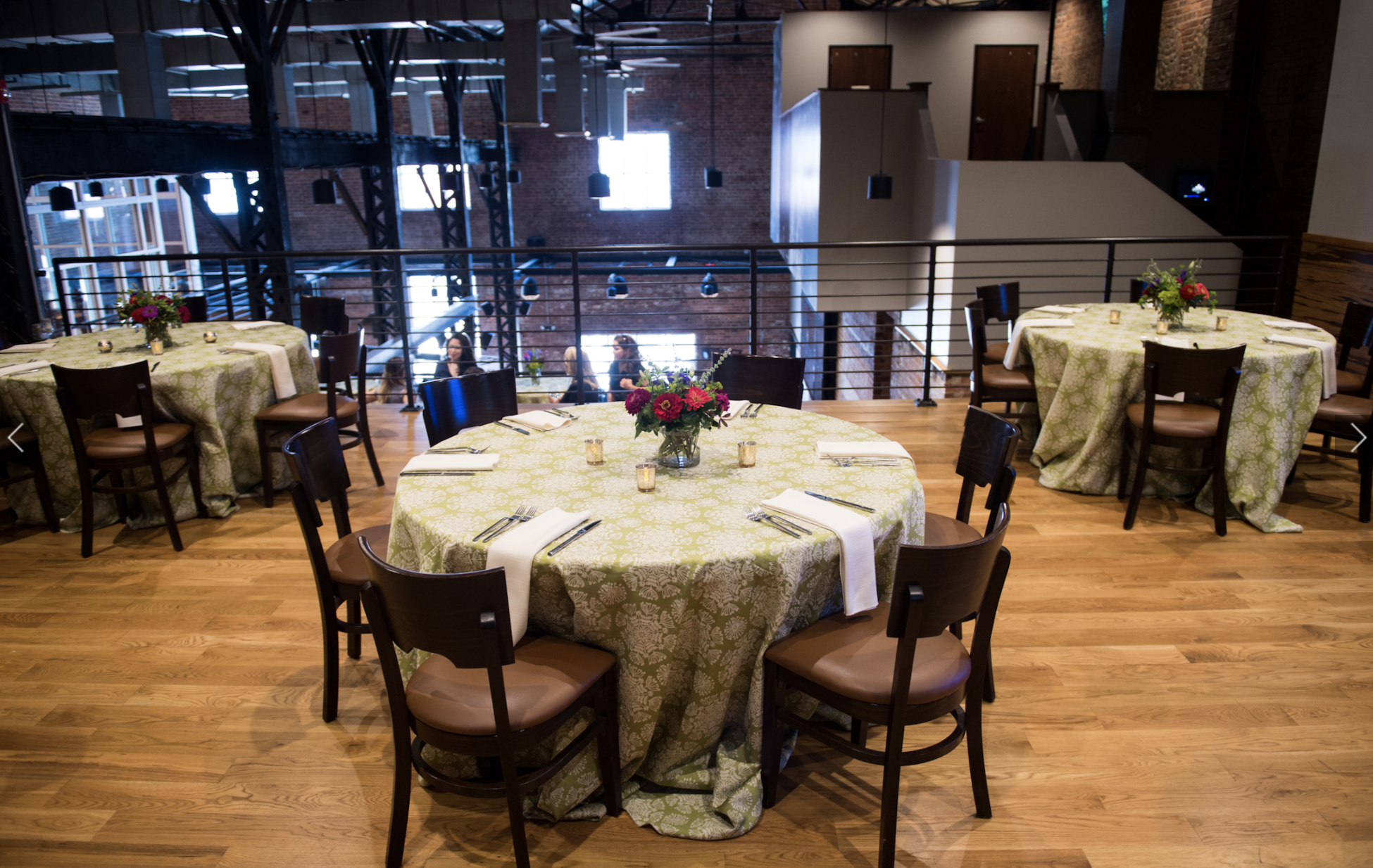 This spacious 710 square foot room provides a comfortable semi-private dining experience, with views of both the Lower Mezzanine and main dining area. Located on its own private level, this space lets guests enjoy great views overlooking the restaurant and brewery. This room is suitable for both cocktail events and seated dinner parties. The space features natural lighting from three high windows and boasts excellent audiovisual capabilities to meet your presentation needs. Private stair entrance and plenty of space to creatively execute an intimate event for a larger group. *Table linens shown here were rented from CE Rental.
