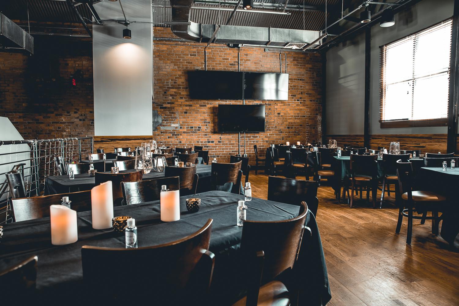 This 575 square foot room provides a comfortable and unique dining experience, floor-to-ceiling glass walls, and a private wrap-around mezzanine where guests can enjoy 180 degree views of the main restaurant. Located directly above the Tobacco Road Brewery, this space allows maximum privacy for your party and features exceptional audio-visual capabilities. Personalizing your event is as simple as connecting to our system via HDMI cord, and three 65” flatscreen HDTVs provide unlimited presentation options. Room features two private entrances and is excellently suited for both seated dinner parties and partially seated cocktail events.