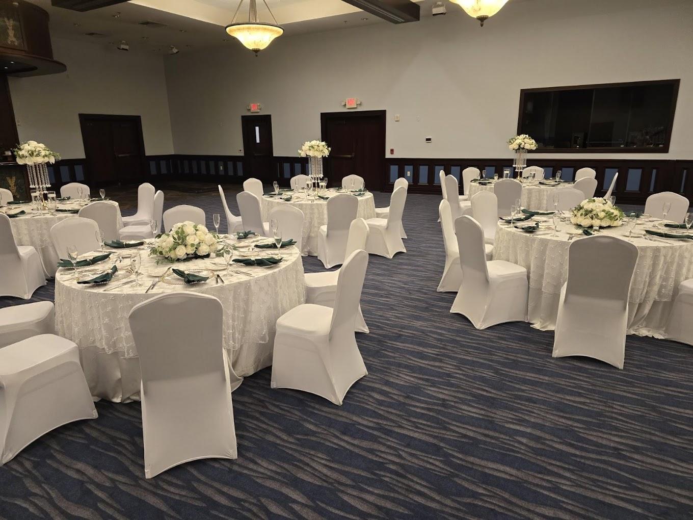Venue rental includes exclusive use of the space, tables, chairs, black or white linens, china, flatware, glassware, private bridal and groom suites, dance floor, stage, customizable floor plan, complimentary parking, and use of our AV system with HD screens and livestreaming. Mirrors and votives are provided for centerpieces, with setup and breakdown handled by our staff.