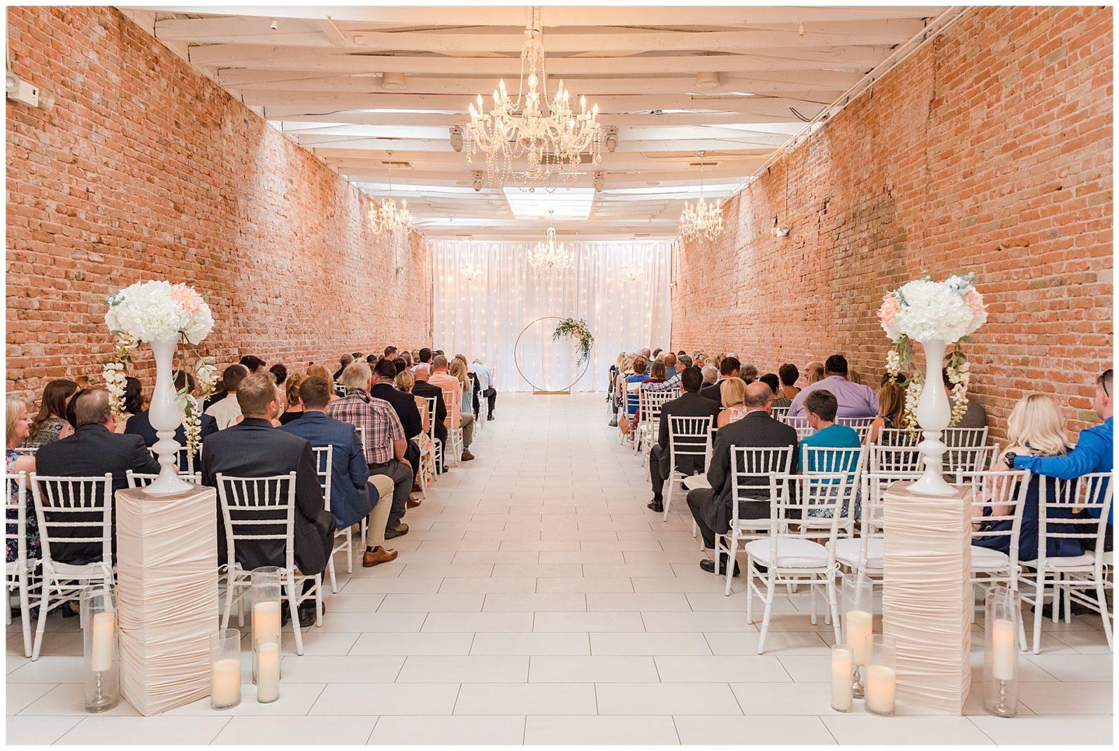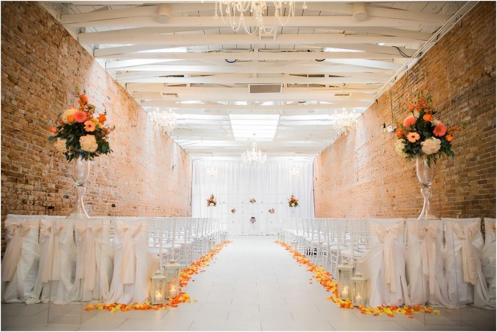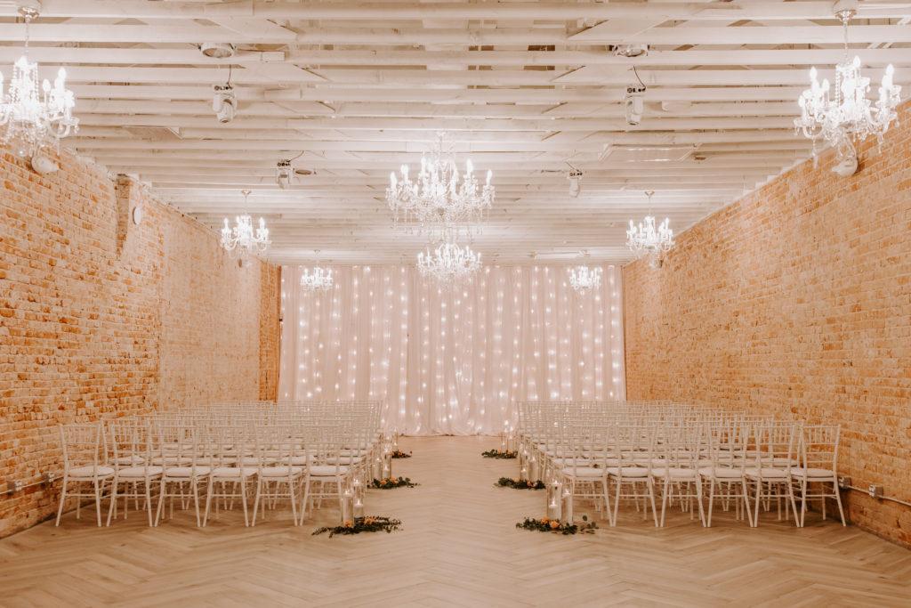 Historic charm meets sophisticated elegance with exposed red brick walls and cathedral ceilings. Draped in elegant white fabric, this serene setting is ideal for high-class ceremonies and stylish receptions.
