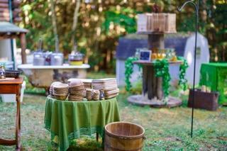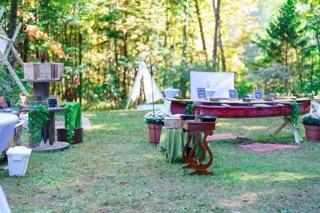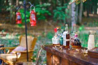 Enter the ceremony site through double doors down a path lined with lanterns and twinkle lights. Guests will be seated on wooden benches and have the perfect view of the beautiful altar. Reception site is close and has different mingling areas set up like the cigar bar, projector and screen and dining tables and chairs! We offer multiple accommodations at no additional charge for overnight guests including unique rentals, such as treehouses, yurts, earth homes as well as cabins and motel rooms!