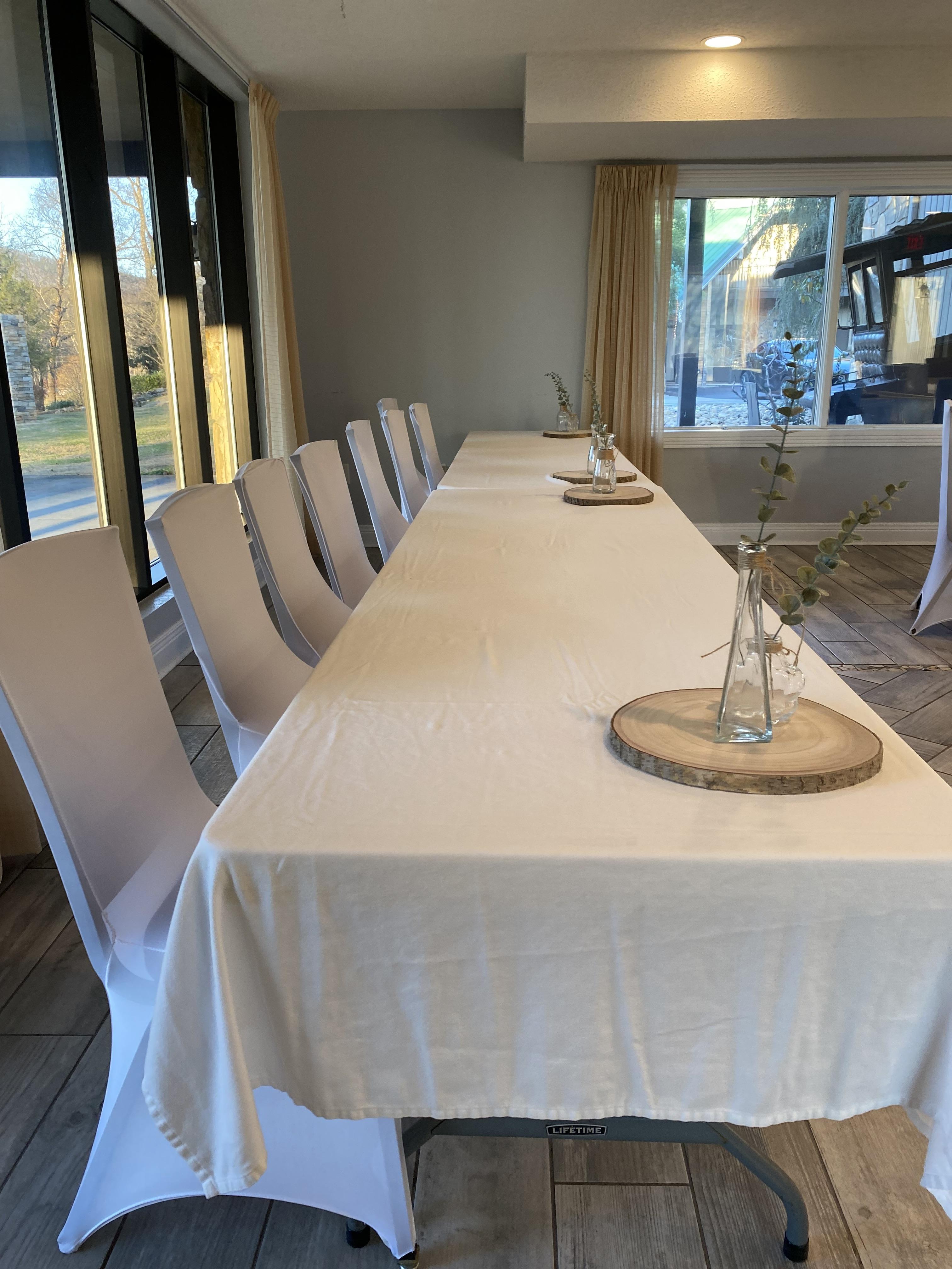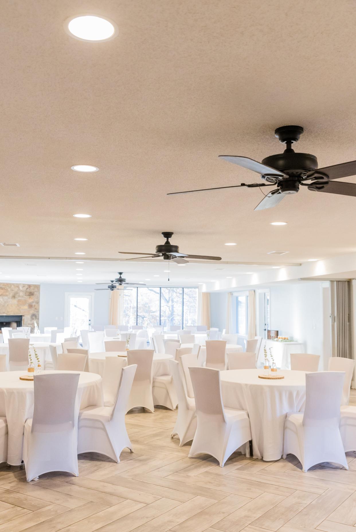 Dimmers for total lighting customization Tables and chairs for your wedding or special event White linens for tables and chair covers In-house catering company Private Bartending services Full Wedding & Event Coordination