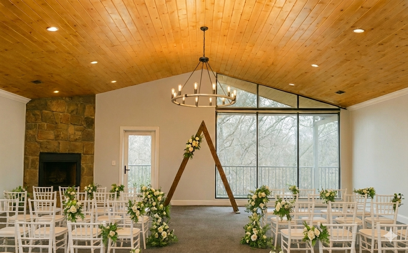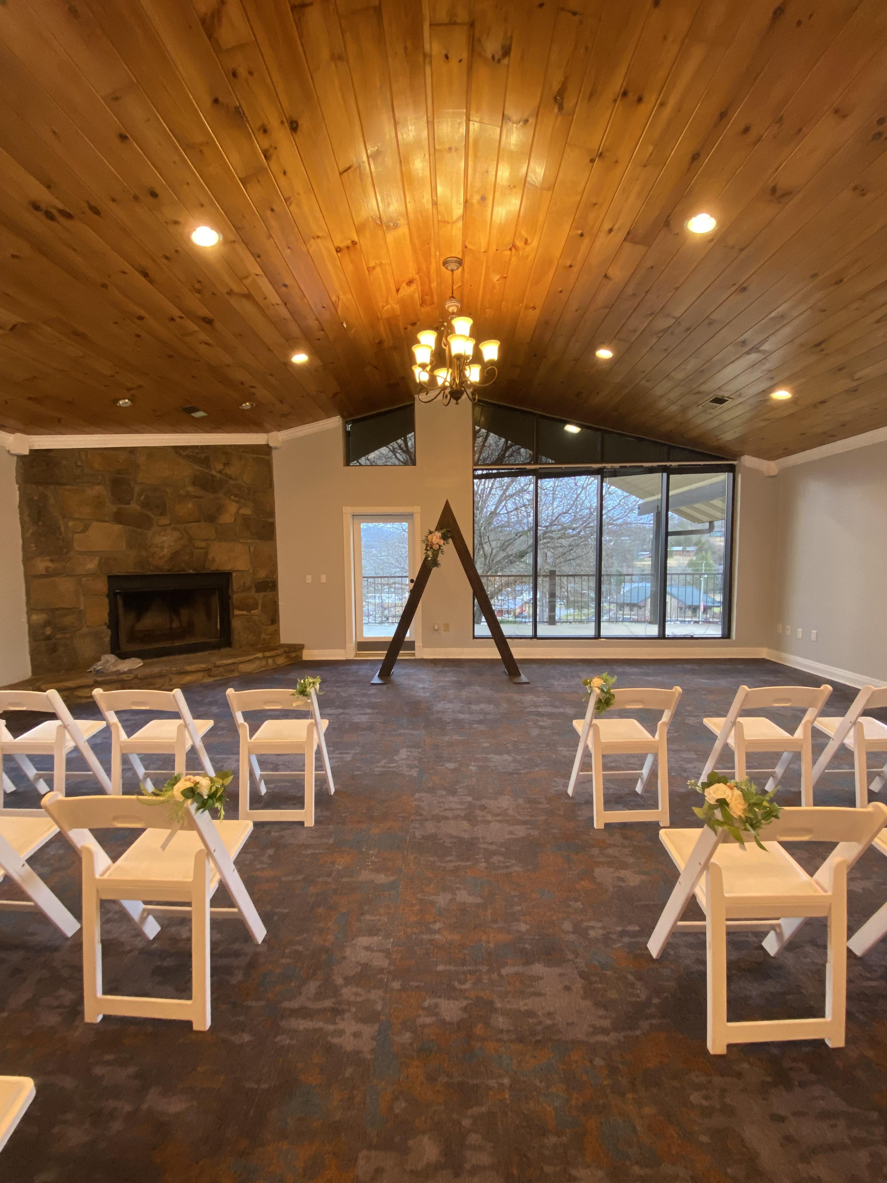 This space provides a beautiful indoor wedding ceremony site to any bride and groom looking for Mountain View’s. Enjoy this peaceful space as a year-round indoor ceremony option, and a perfect plan B option in case of inclement weather during the peak season months. We will set up white garden chairs to provide the perfect path to walk down the aisle way and tie the knot.
