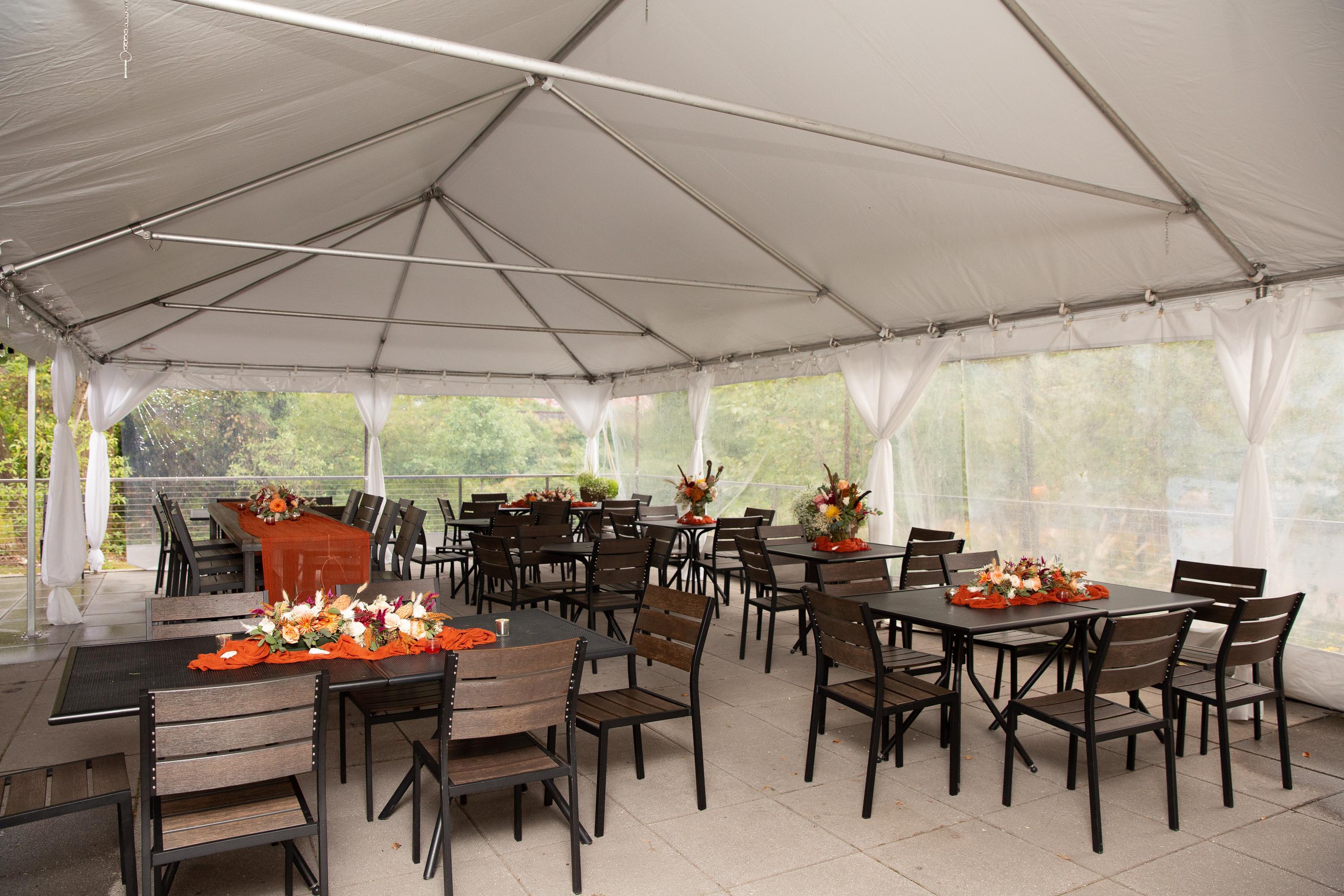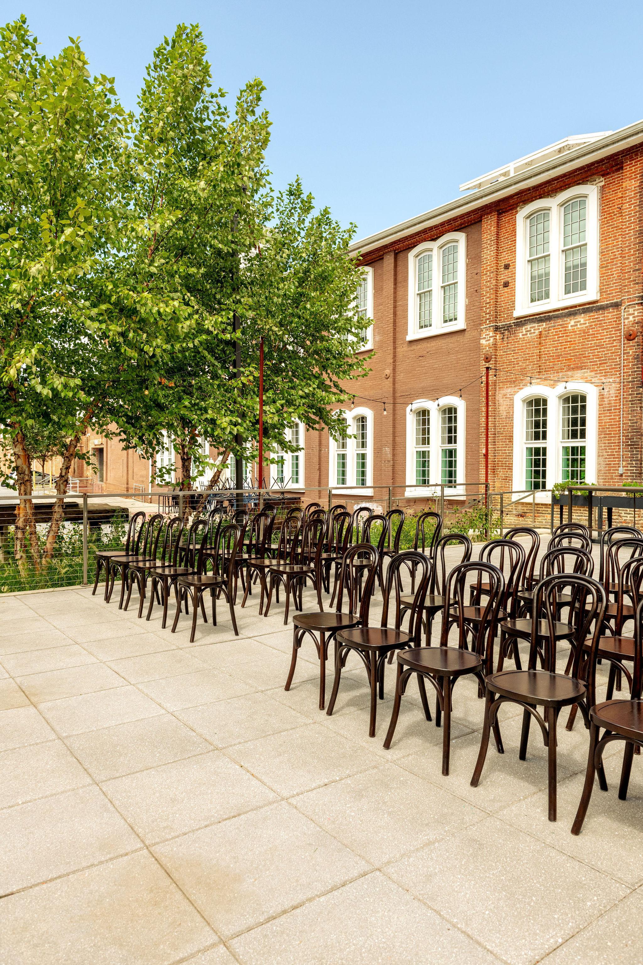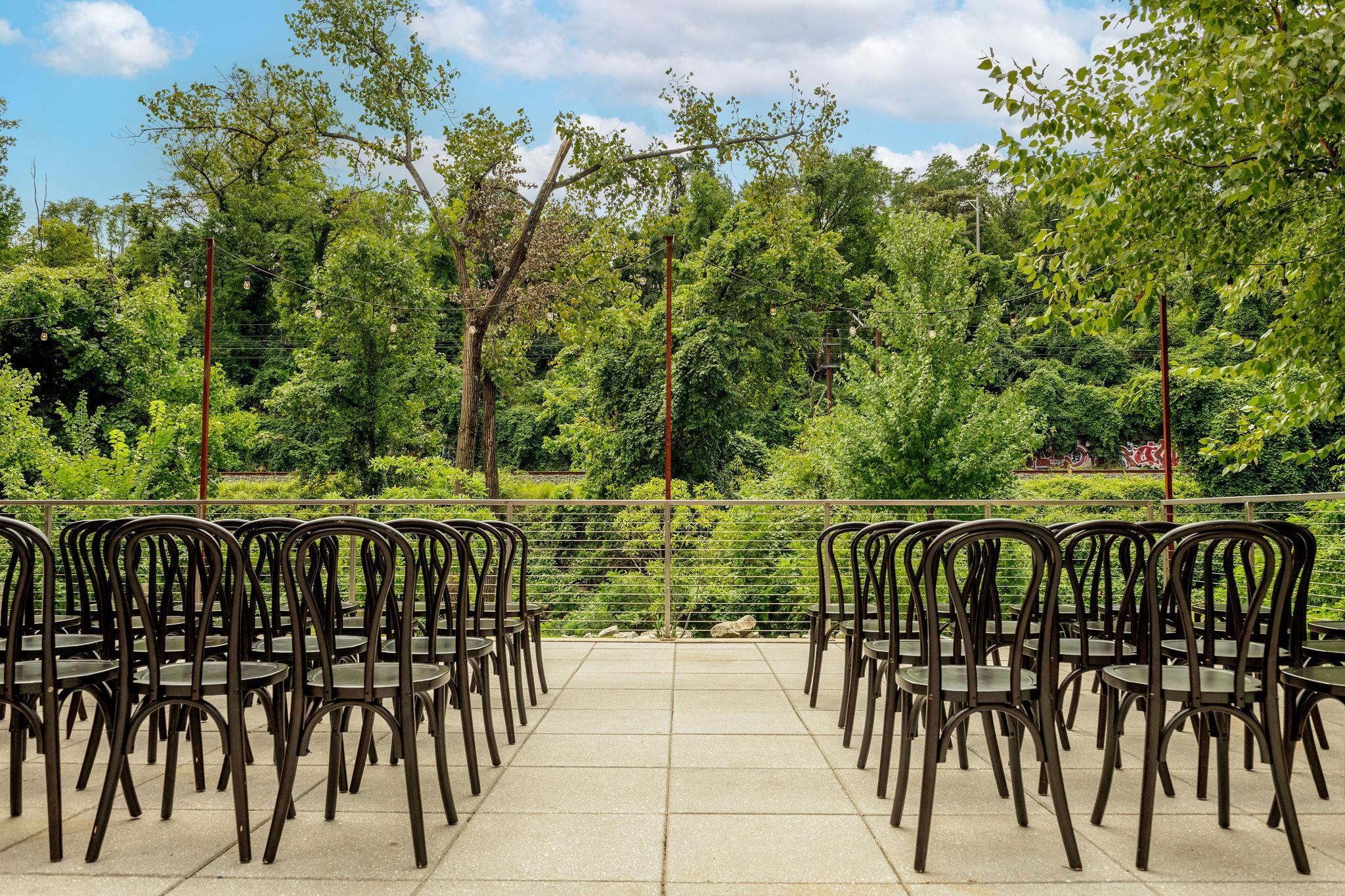 Our terrace overlooks Jones Falls, providing beautiful views of the water. This area features a stylish curved private bar complete with a TV, as well as charming string lights, outdoor tables and chairs. A heated tent can be rented for an additional cost ranging from $1,500 to $3,000. The terrace is perfect for an outdoor ceremony, cocktail hour, engagement party, welcome party, and more!