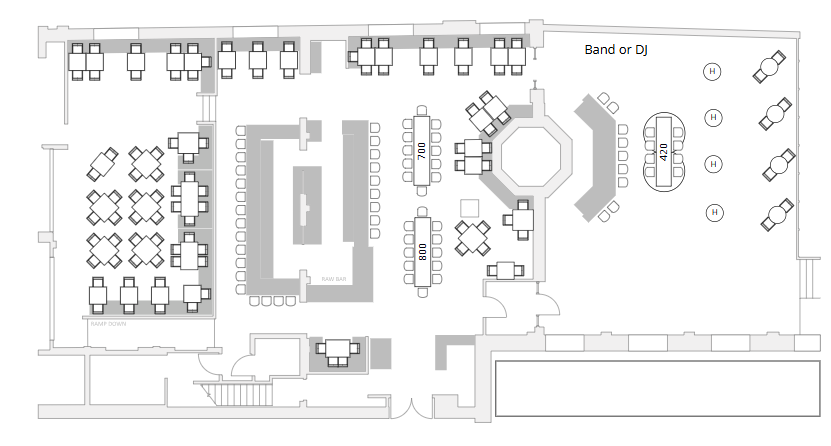 - Refined lounge area with high-top tables - View of raw bar & shucker - Private bar with two TVs