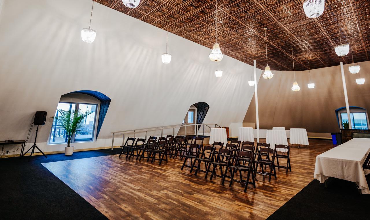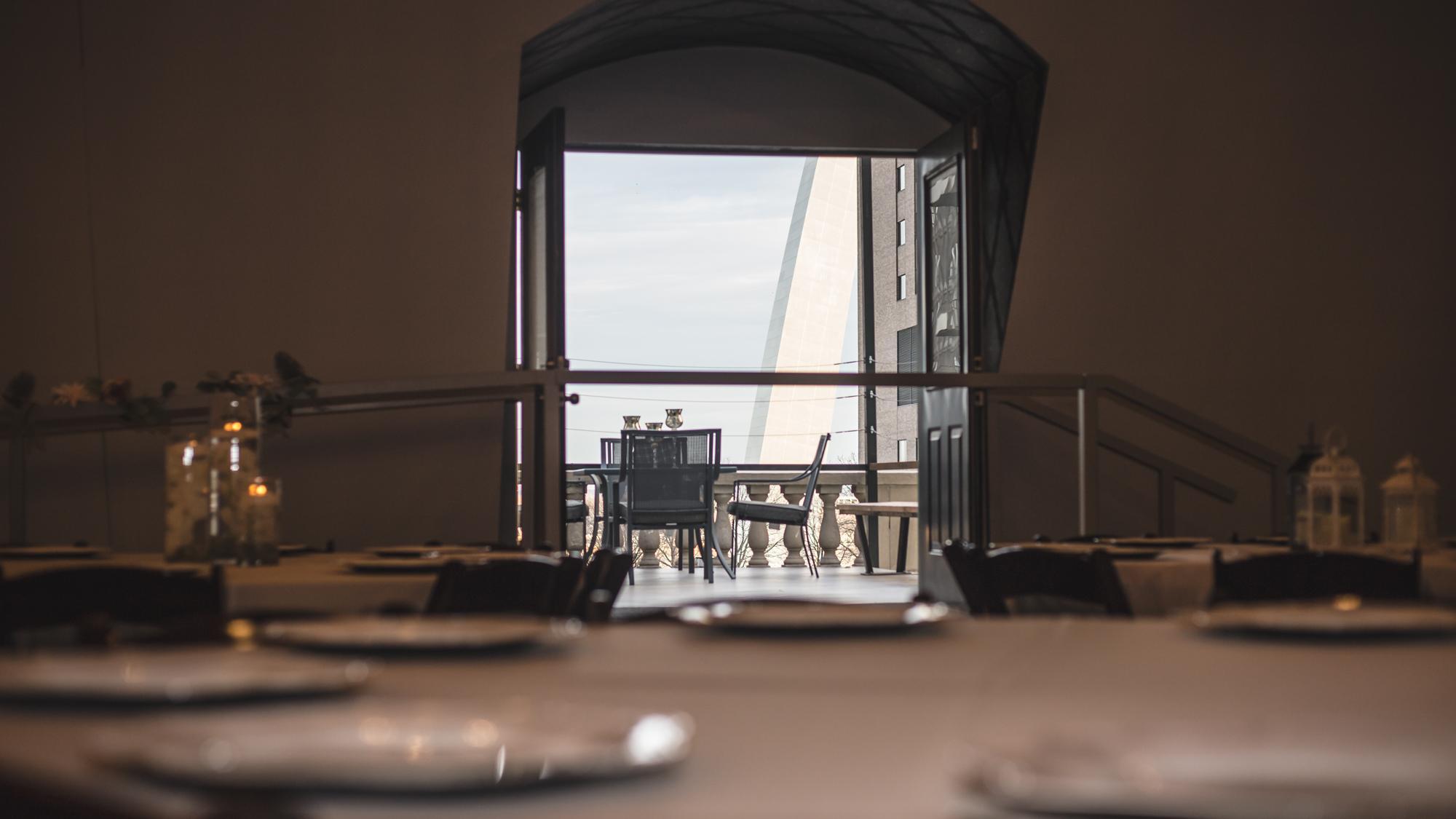 Soaring copper ceilings, antique chandeliers, and period finishes make a statement as they shine over the hardwood floors of the Ballroom at Trust. Oversized accent windows wrapped in striking black and gold wallpaper create a classic setting that is perfect for small intimate gatherings or large events and parties. The City of St. Louis bustles under the patio deck while providing magnificent views of the Arch and Mississippi River.