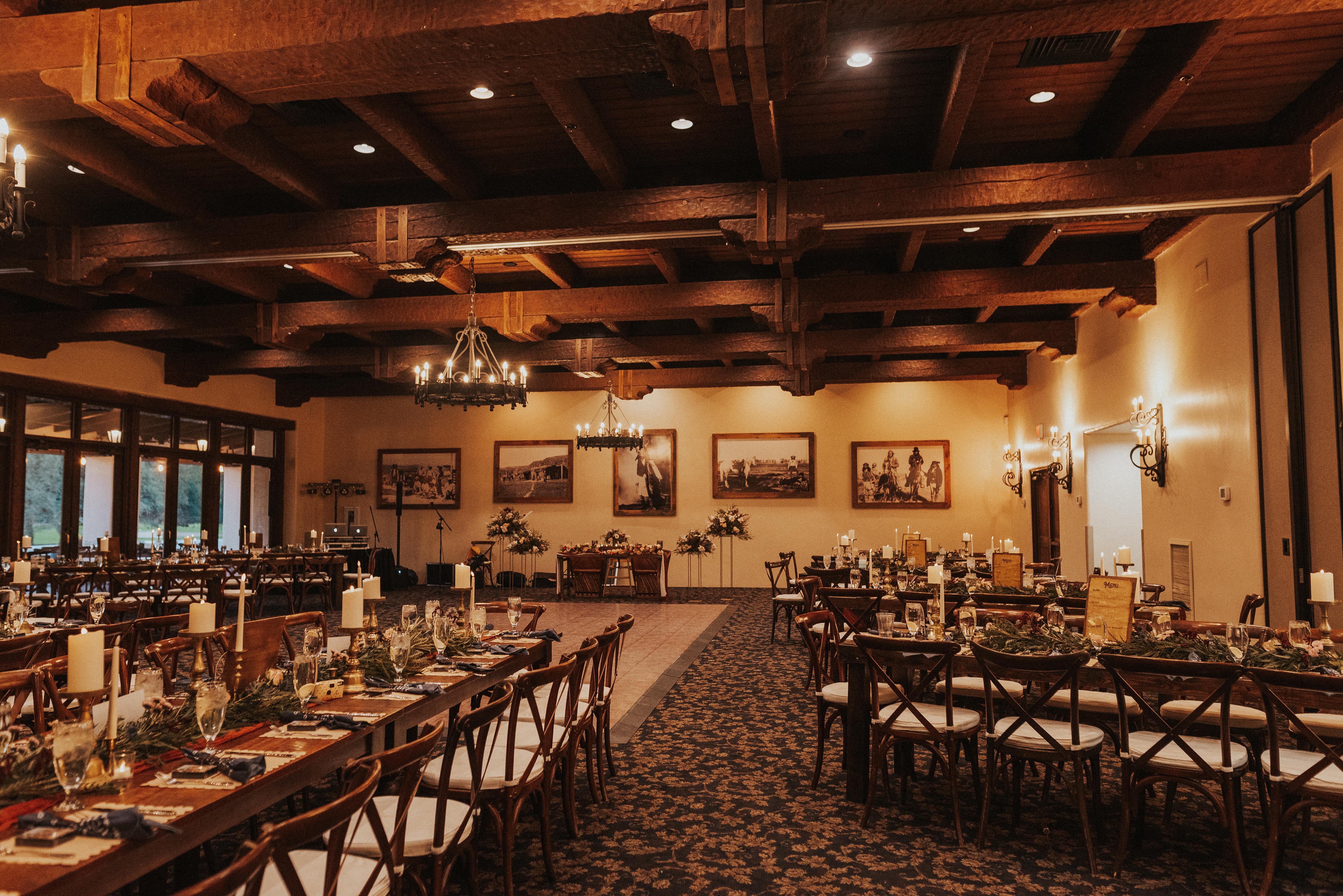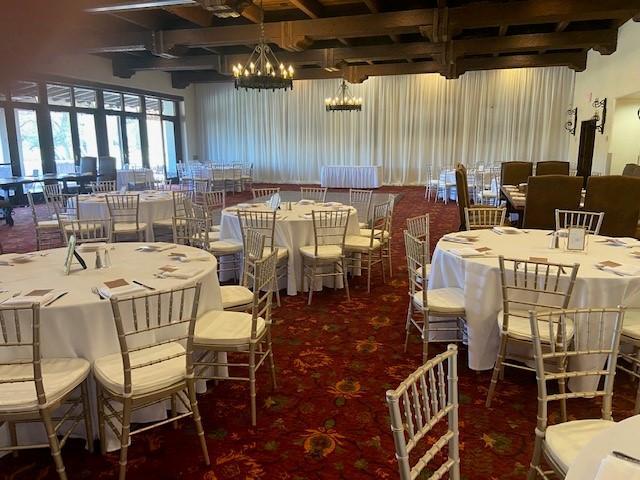 The Geronimo Ballroom features a 14 foot high open beam ceiling, stone fire place, floor -to-ceiling windows and the option for a covered patio overlooking the resorts signature Anza 9th hole.