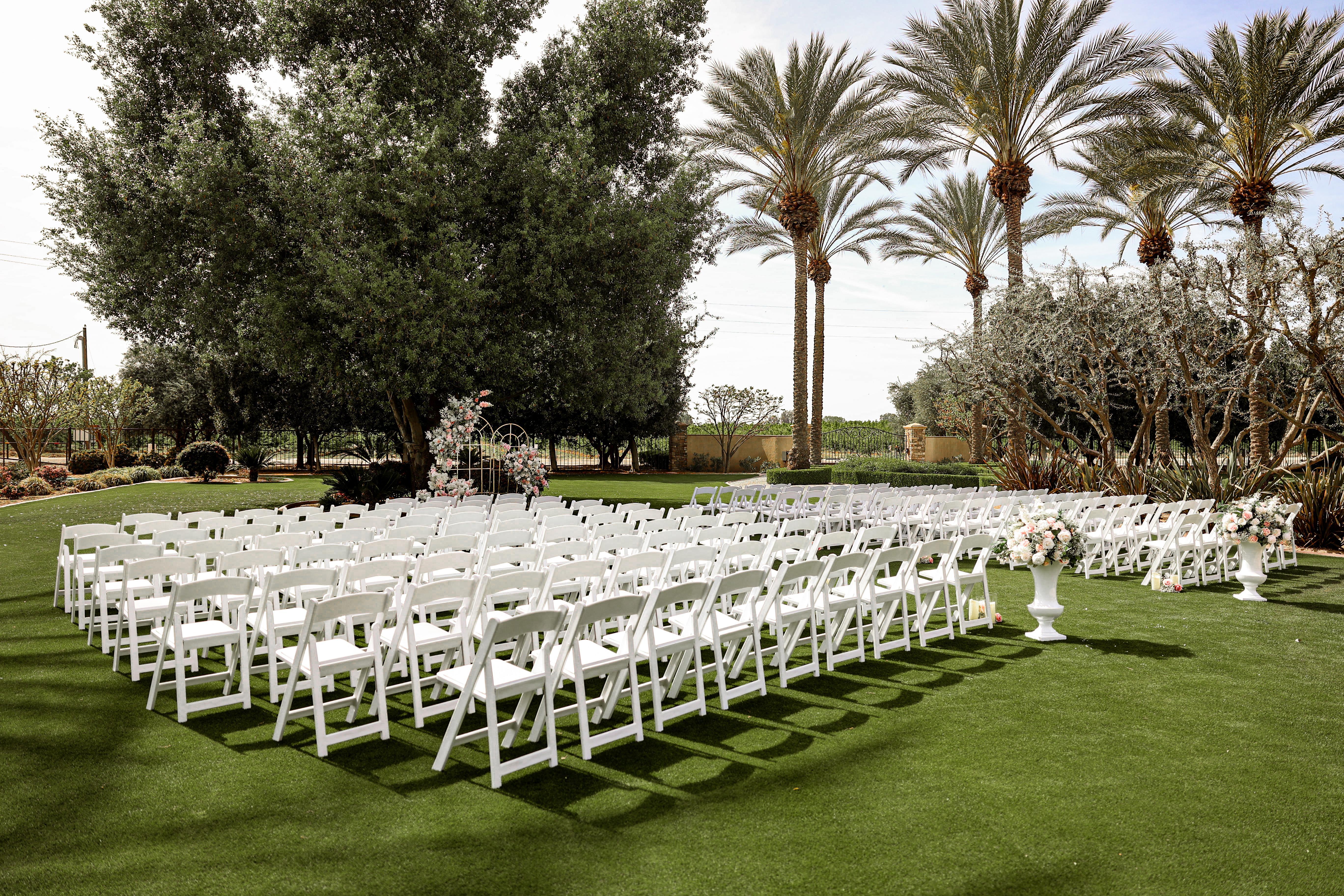 This space features lush greenery, majestic olive trees and beautiful scenery all around. Ceremony seating is shaded and comfortable in any season.