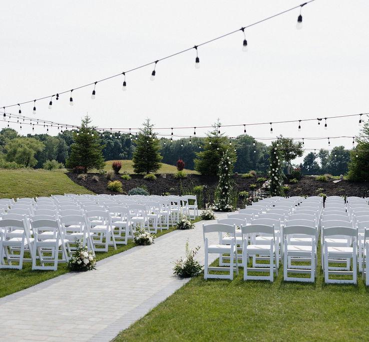 Reception Area for Up to 300 Guests / Two Updated Getting Ready Suites / Outdoor Ceremony Space / Tables / White Padded Folding Chairs / Prep Area / Heating and Cooling