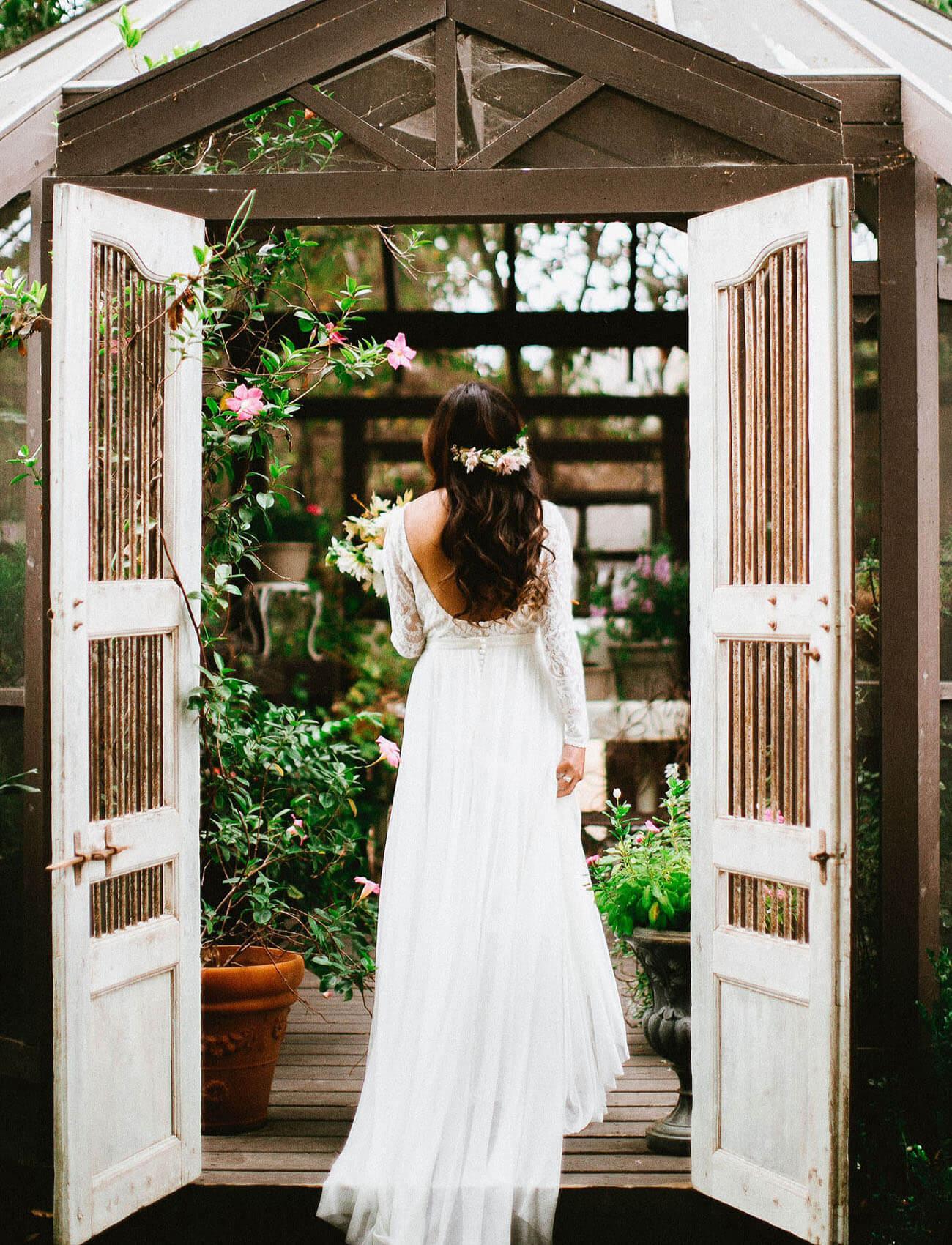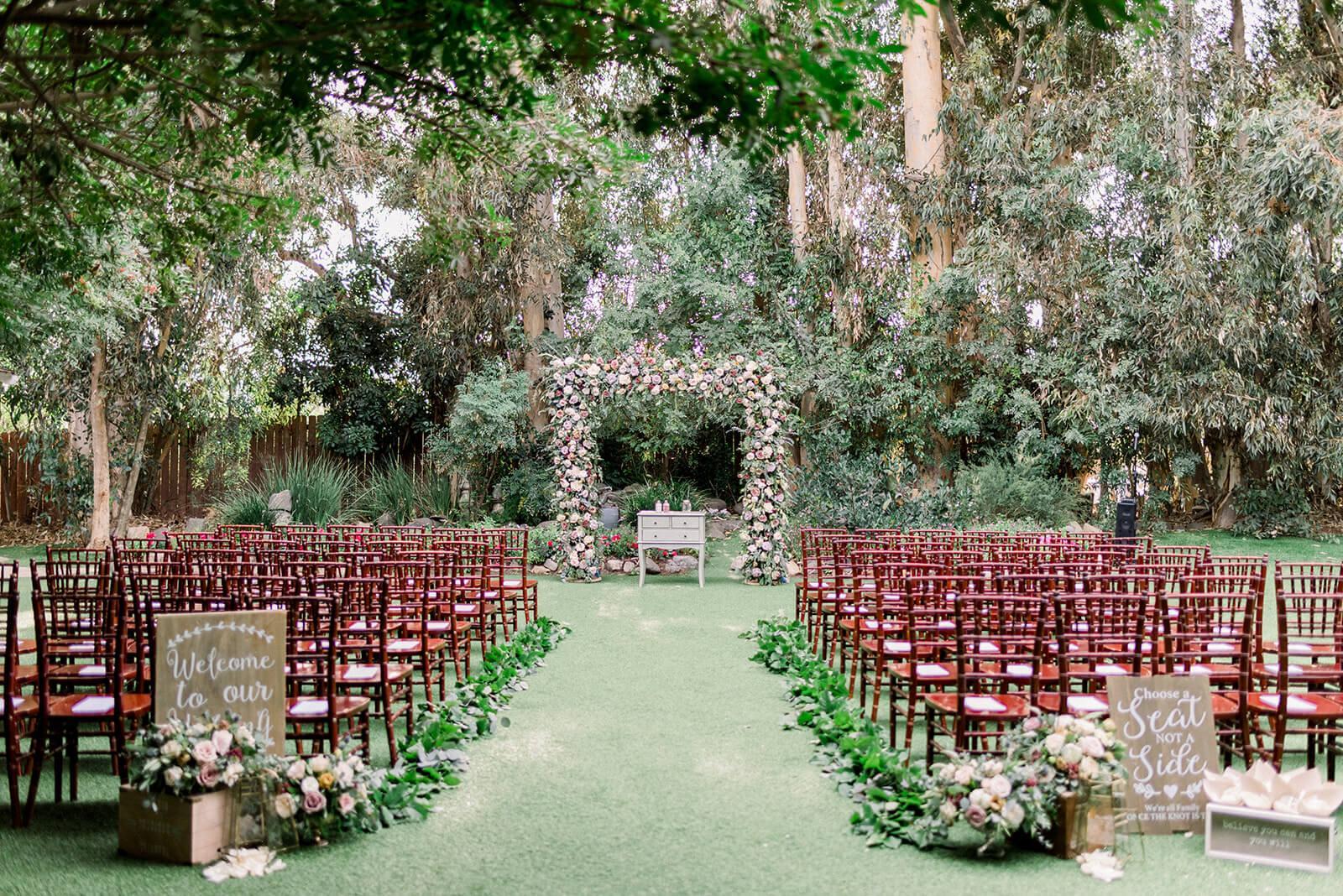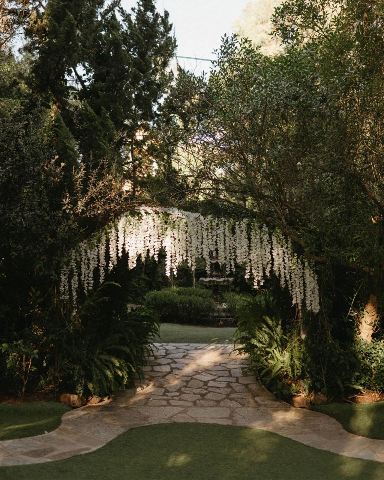 An intimate setting tucked amongst lush vines, angels, and butterflies.