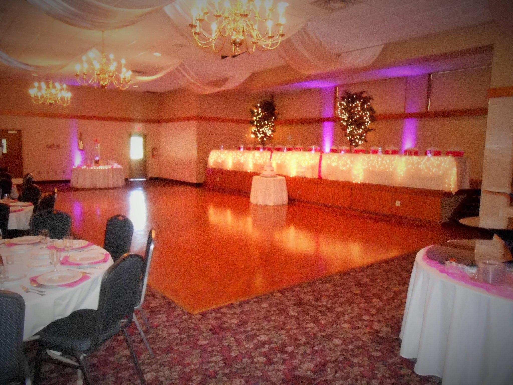 Up to 250 guests can join couples on their special day at Bella Catering & Events at Twinhaven. The ballroom can be set up for ceremonies or receptions. For ceremonies, chairs are placed behind and upon the dance floor to form an aisle. At the end of the aisle, a spotlight illuminates couples as they exchange their vows and begin the rest of their lives together. For receptions, tables and chairs are placed around the wooden dance floor. The spotlight, used when necessary, is replaced by golden chandeliers that give the room a bright or ambient glow, depending on couples’ needs.