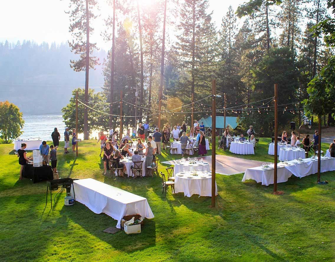 Begin your happily ever after amidst the natural beauty of the outdoors at Twinlow Camp & Retreat Center. Located on the shores of Lower Twin Lakes in North Idaho, this scenic venue offers a picture-postcard setting for your wedding celebration. With over 40 acres of forest and lake shore, Twinlow provides a serene and beautiful escape for you and your guests. The camp’s unique and flexible spaces, coupled with comfortable overnight accommodations, allow you to turn your wedding into a weekend-long celebration. Twinlow is the perfect choice for couples seeking a personalized, fun, and affordable wedding experience in a breathtaking natural setting.