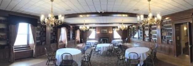 Darker wood paneling, burgundy and navy rug and accents, one fireplace, shelves full of vintage books, five windows with natural lighting, partial view of lake, navy drapery, masculine & homey-comfortable feeling. Drop-down projection screen in ceiling. Capacity (33' x 28') 64 people at 60-inch Banquet Rounds of Eight | 45 people at U-Shape | 75 people Theater Style | 40 people Classroom Style | 100 people Stand-Up Cocktail Reception