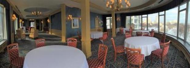 Neutral coloring – cremé & taupe, mustard drapery, three large windows with lots of natural light-view of neighboring buildings, murals of Niagara Falls and West Point Academy. Capacity (42' x 24') 64 people at 60-inch Banquet Rounds of Eight | 30 people at U-Shape | 75 people Theater Style | 40 people Classroom | 100 people Stand-Up Cocktail Reception