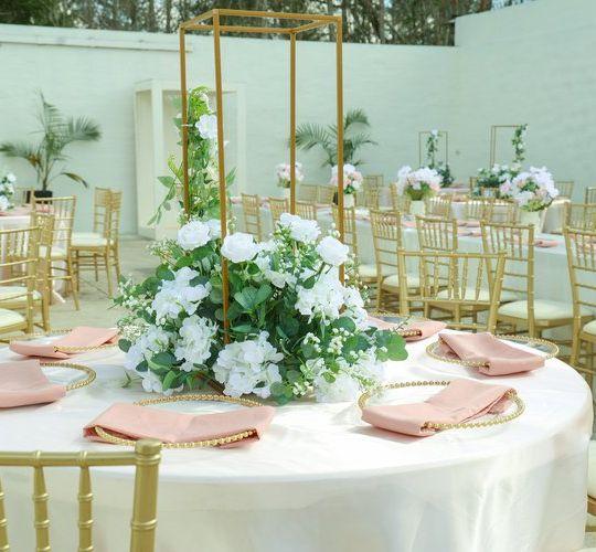 - 6,000 sq. ft. Open-Air Reception Hall - Use of Grounds for Engagement Photos - One Hour Complimentary Rehearsal - Tables and Chairs for Ceremony and Reception - Bridal Suite with Getting Ready Stations, Pedestal Stage, Lounge Areas - Grooms Lounge with comfortable seating, 65” TV